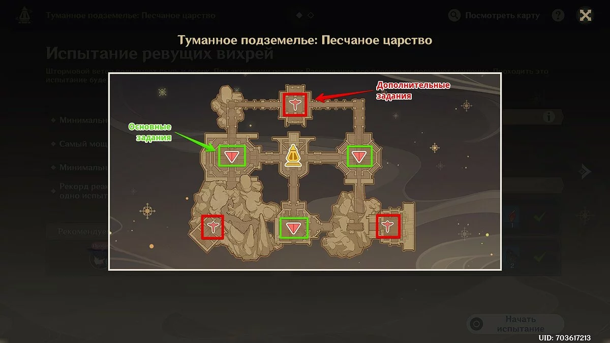 Для начала стоит ознакомиться с картой данжа. На ней изображены шесть испытаний: три основных и три дополнительных.