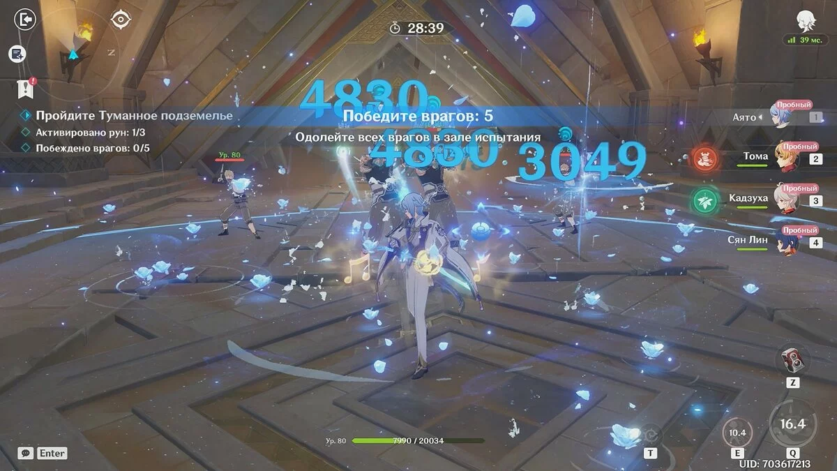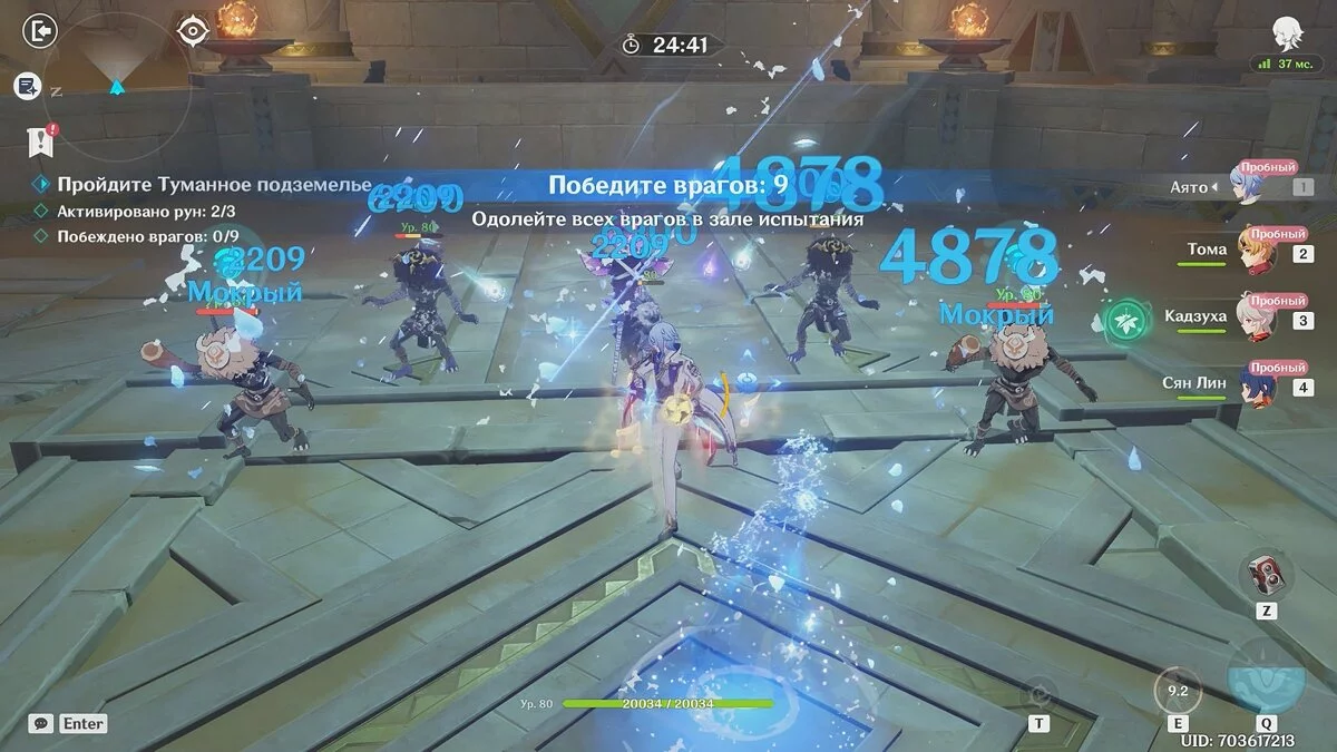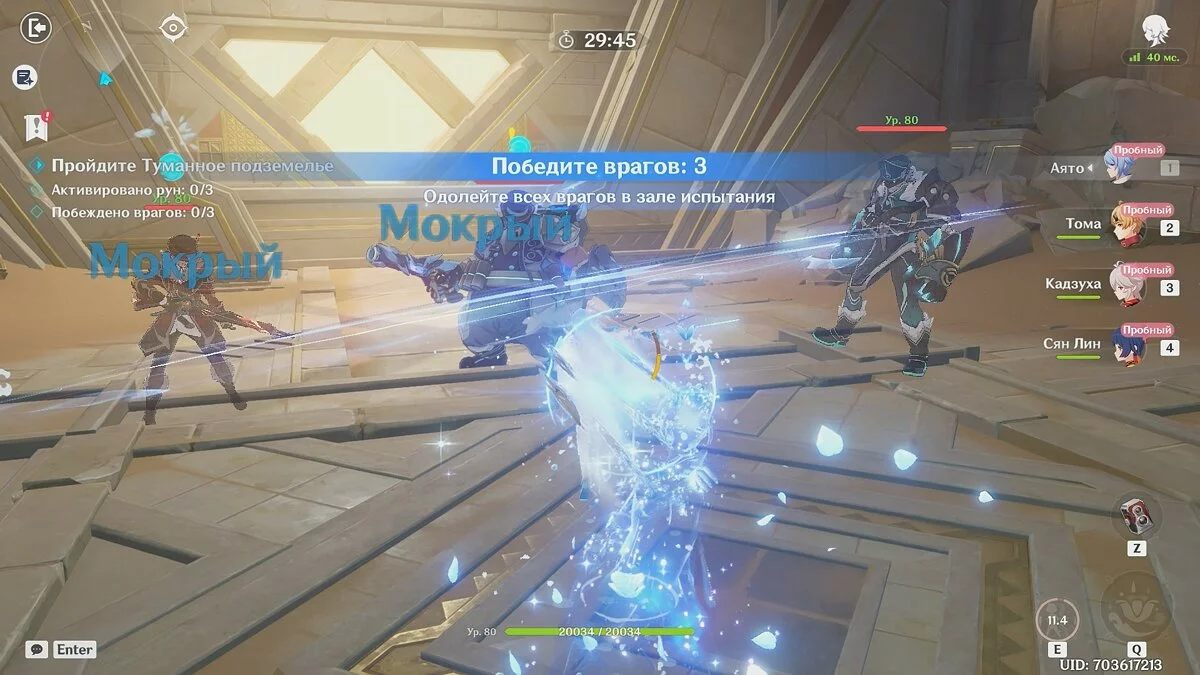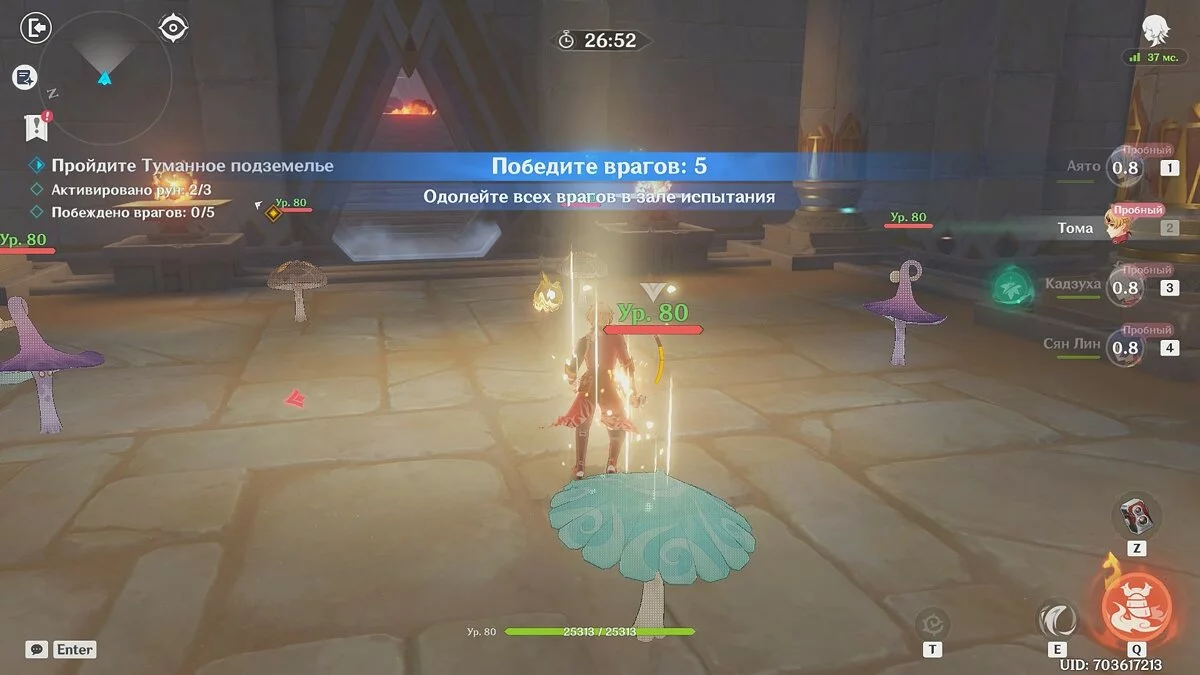 Всего в этом бою нужно одолёть трёх высокоуровневых врагов — двух часовых руин и одного руинного молотильщика. Используйте Гидро умения Аято и атаки Пиро персонажей, чтобы создавать реакцию «Пар» и быстро расправиться с врагами.