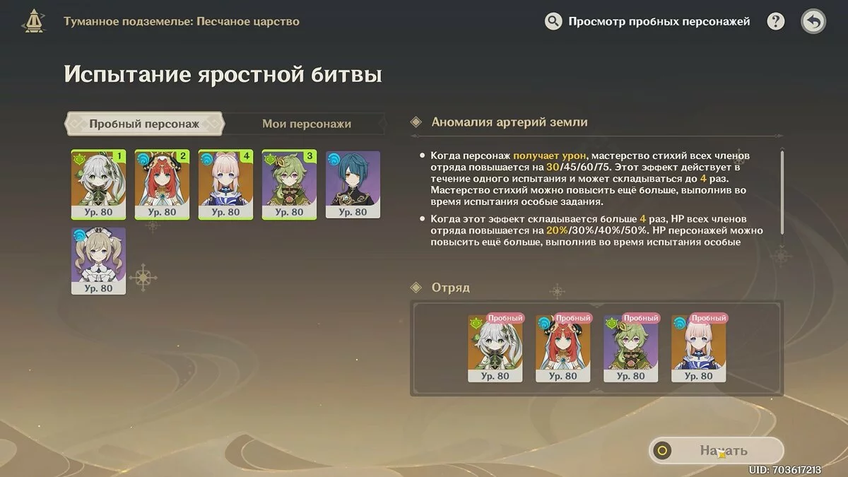 Откройте меню событий и перейдите в соответствующую вкладку. Выберите этап, который вы хотите выполнить, затем соберите отряд из пробных героев.