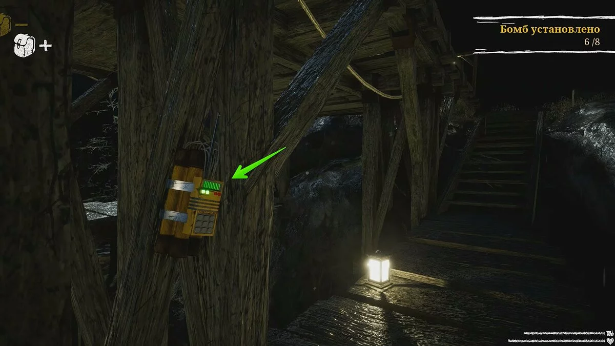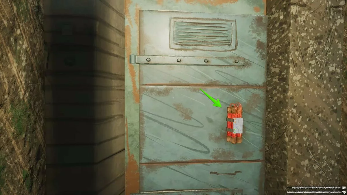 Войдите внутрь и осмотрите ящик у фонаря. Здесь есть взрывчатка. Возьмите её и прикрепите к двери, ведущей в шахту. Отойдите подальше.