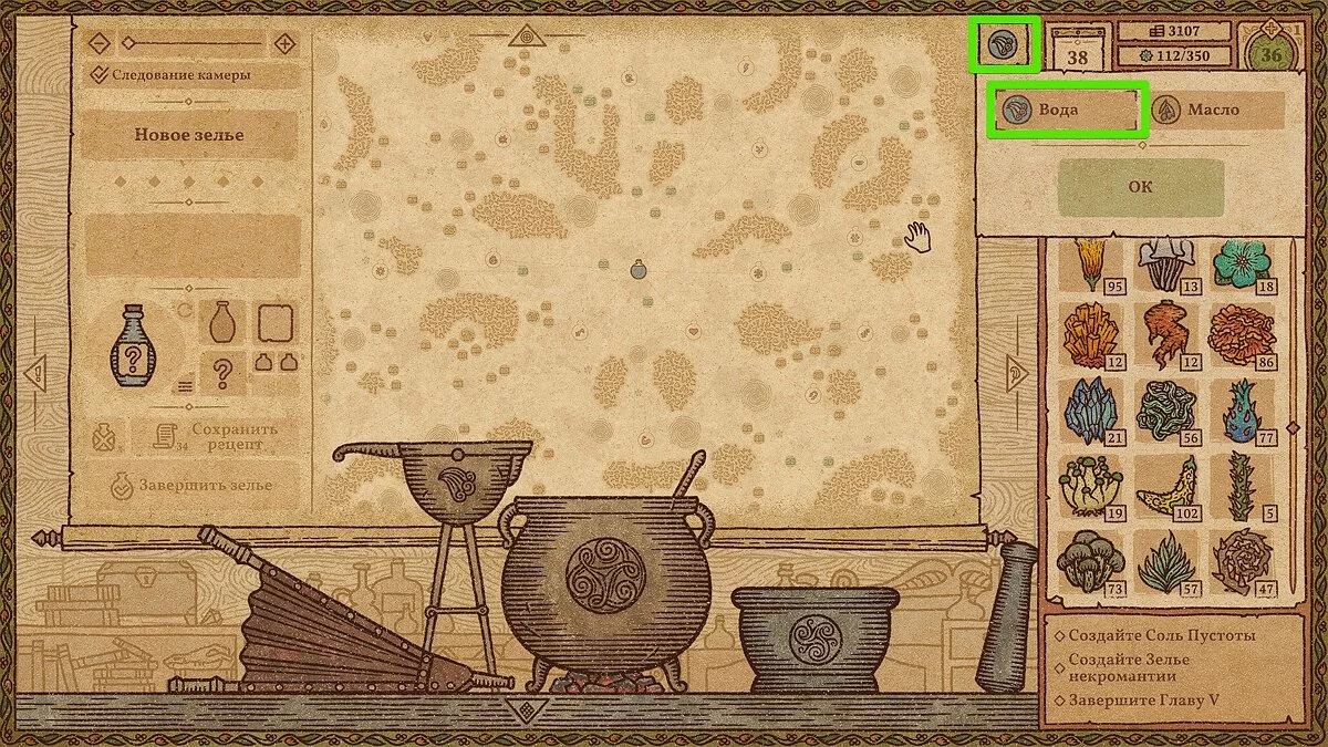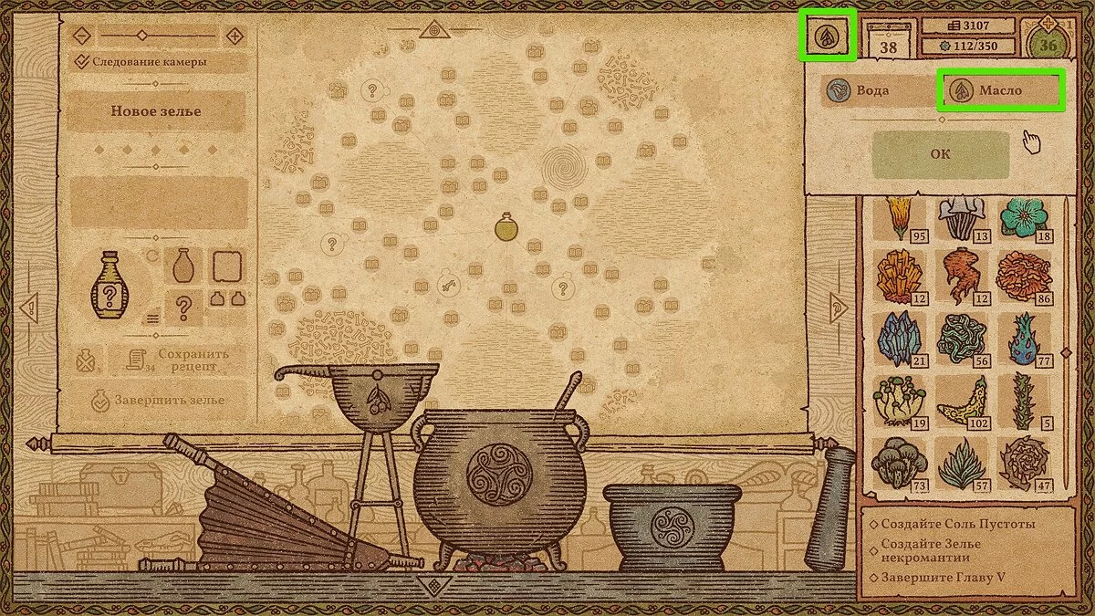 Чуть позже вы сможете приобрести у алхимика-торговца масло. При его использовании карта зелий изменится. Игроки смогут создавать различные зелья, используя совершенно другие ингредиенты.