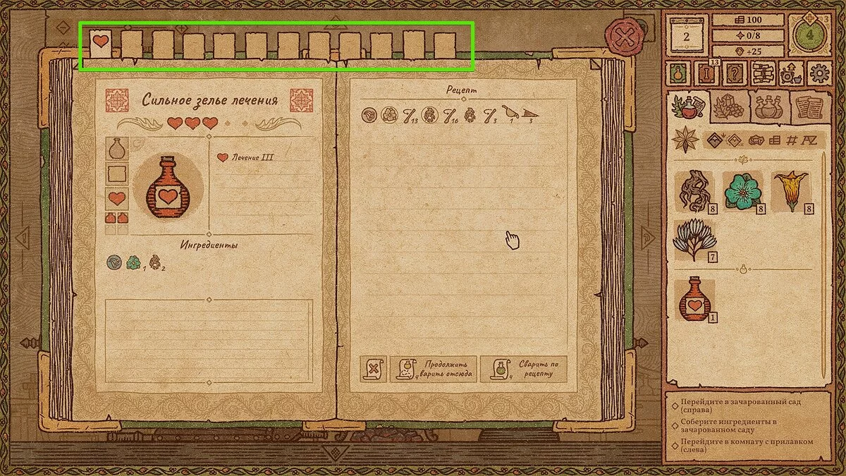 - Если иконка рецепта (баночки) расположена горлышком вверх-вправо или вверх-влево — можно создать зелья только 1 и 2 уровней;