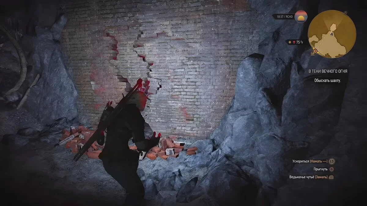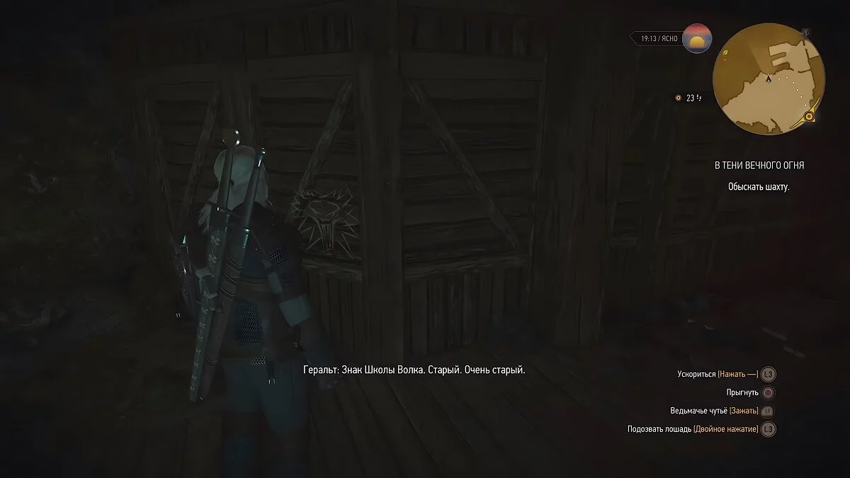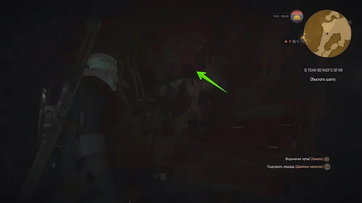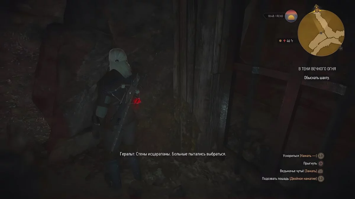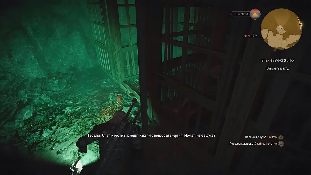 С его помощью осмотрите тени в помещении и кости в дальней комнате. Не забывайте пользоваться ведьмачьим чутьем, чтобы находить полезные предметы. Добравшись до развилки, вы услышите таинственный голос, который прикажет свернуть в штольню справа. Но следовать туда не нужно. Вместо этого сверните налево и бегите по следам ведьмачьего чутья. Рисунки Школы Волка также можно осмотреть.