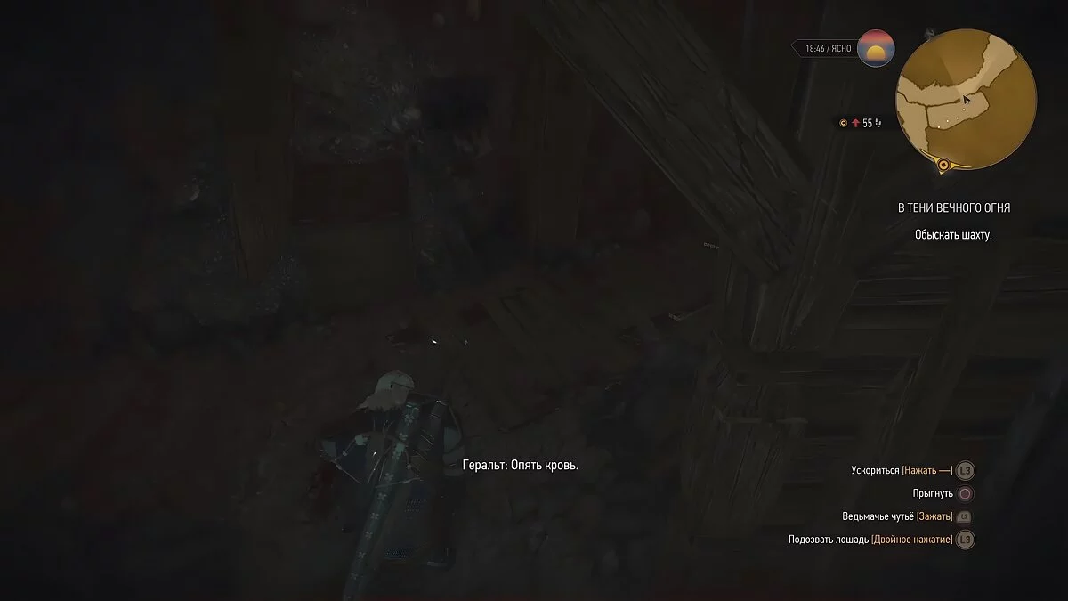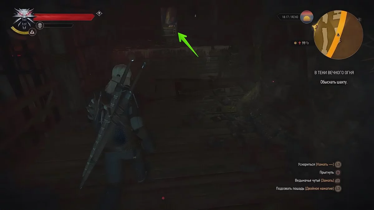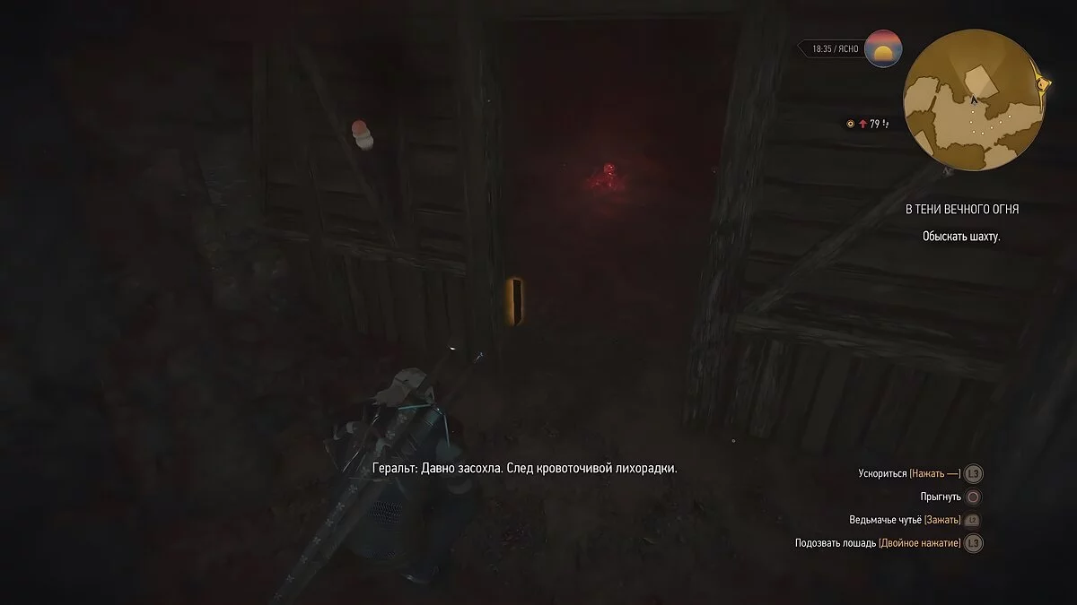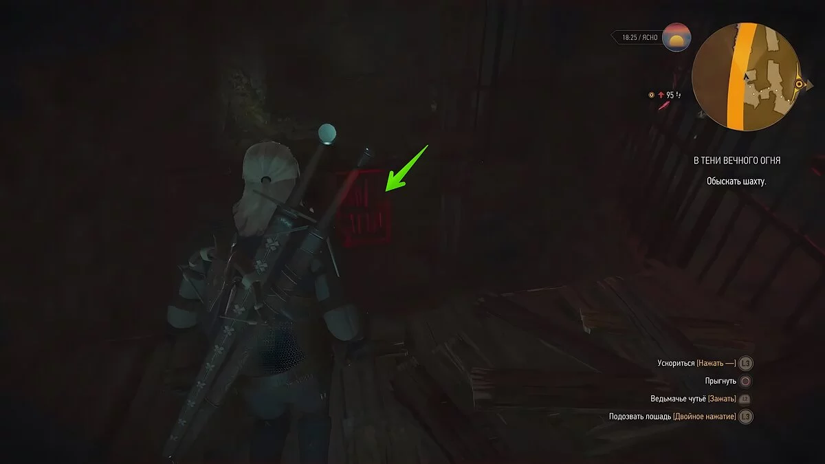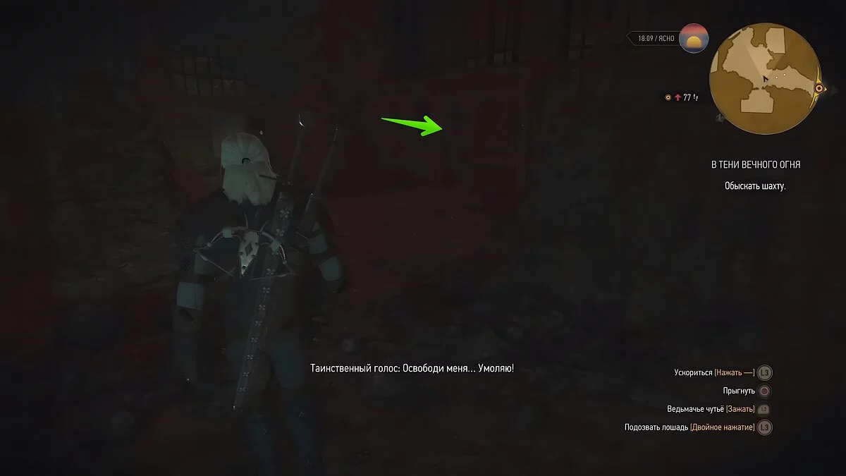 С его помощью осмотрите тени в помещении и кости в дальней комнате. Не забывайте пользоваться ведьмачьим чутьем, чтобы находить полезные предметы. Добравшись до развилки, вы услышите таинственный голос, который прикажет свернуть в штольню справа. Но следовать туда не нужно. Вместо этого сверните налево и бегите по следам ведьмачьего чутья. Рисунки Школы Волка также можно осмотреть.