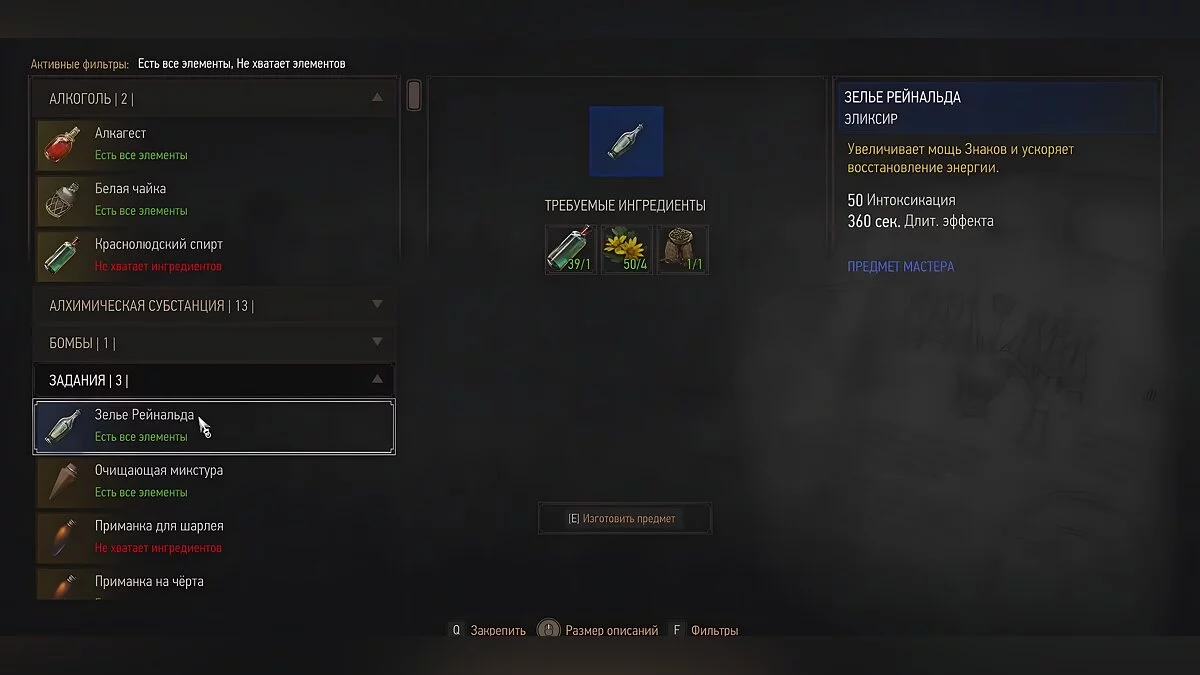 Откройте раздел «Алхимия» и изготовьте эликсир. Если нужных ингредиентов не хватает, вы можете вернуться к выполнению задания позже. Краснолюдский спирт можно отыскать в различных ящиках в пещере.