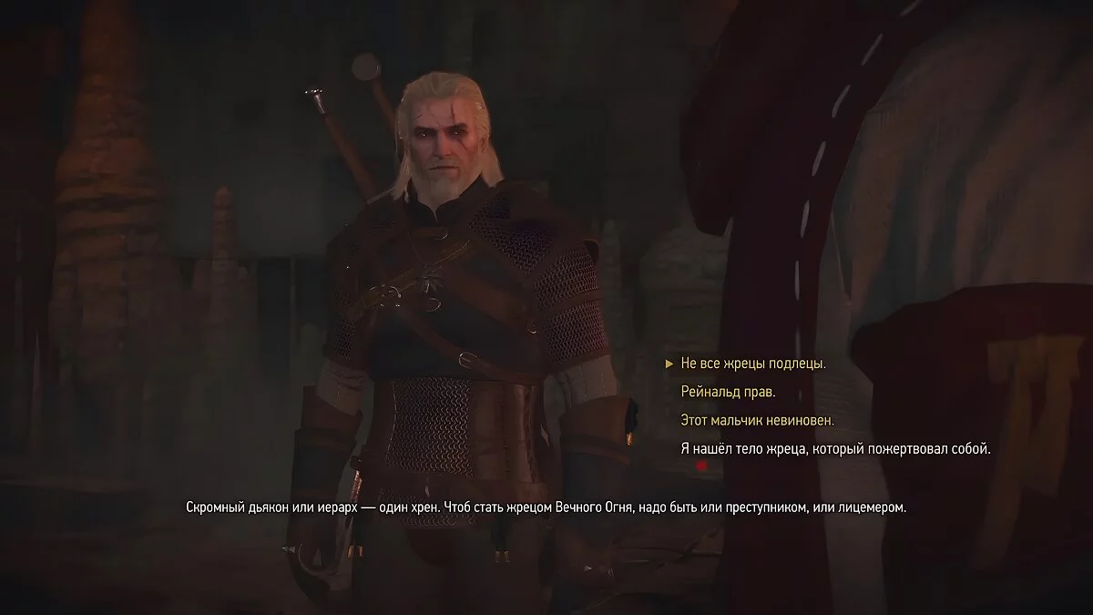 - Этот мальчик невиновен — из-за того, что Геральт сделал акцент именно на его персоне, Рейнальд не сможет простить секту в лице парня, и убьёт.