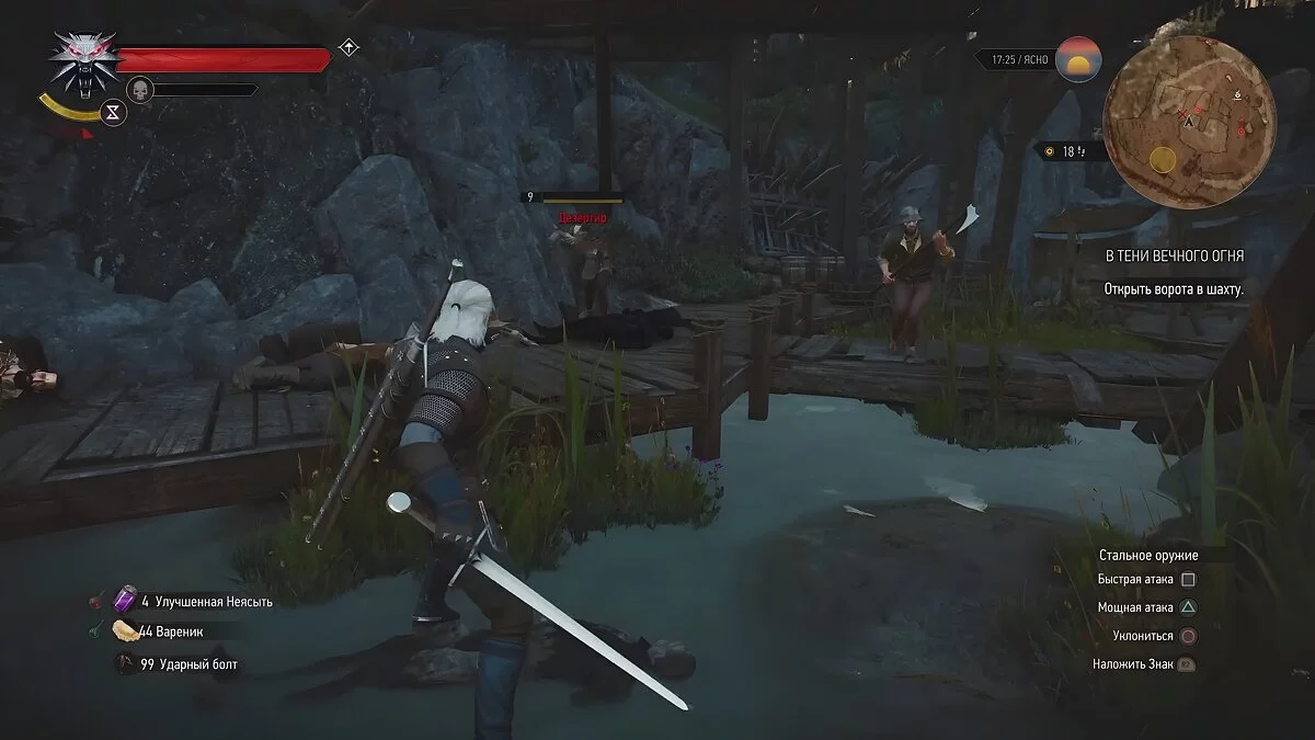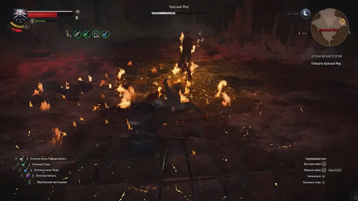Перед тем как начать сражение, мы рекомендуем подготовиться. Вам предстоит драться с двумя врагами поочередно: первым станет одержимый Рейнальд, который неплохо экипирован и также использует ведьмачьи знаки. Второй — Красный Мор — дух, завладевший телом ведьмака.
