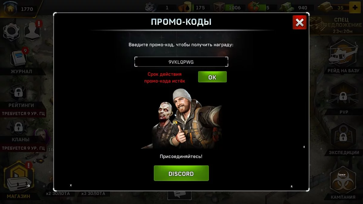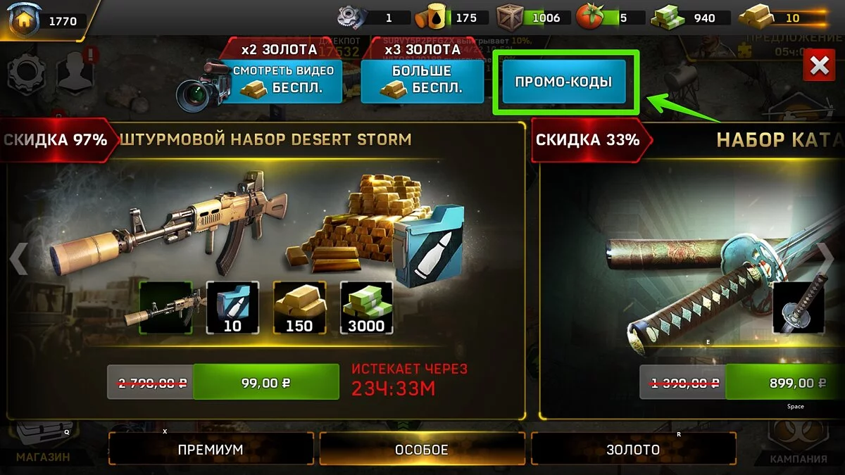 В открывшемся окне станет доступна кнопка «Промо-коды». Нажмите на неё и введите один из активных подарочных кодов, которые указаны в разделе ниже.