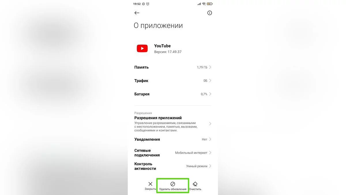 - Нажмите на кнопку «Удалить обновления» и полностью удалите последние обновления YouTube с вашего смартфона или планшета.