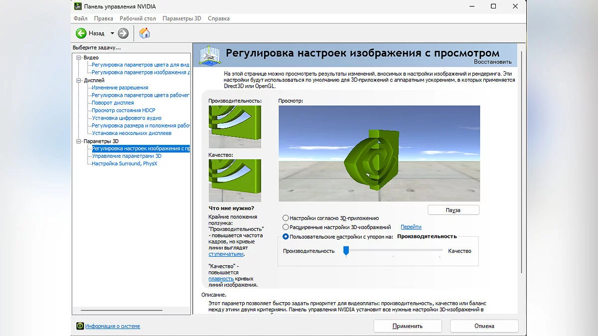Далее переходим во вкладку «Управление параметрами 3D». В открывшимся окне выставляем оптимальные значения (порядок действий может отличаться):