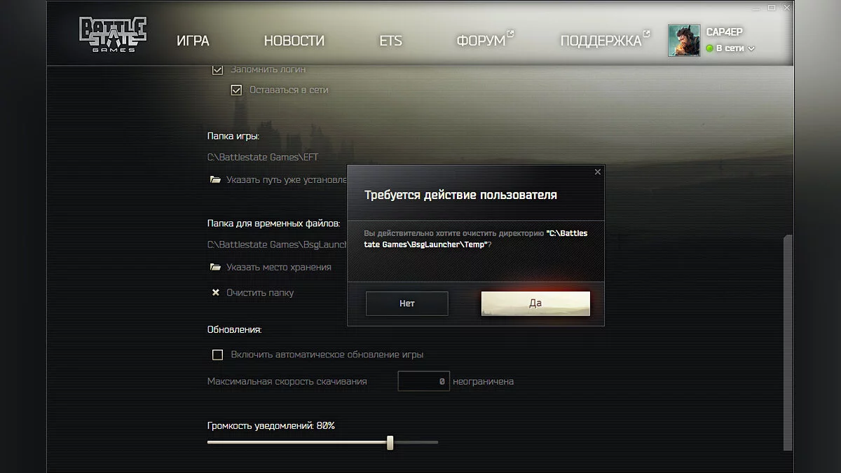 Прокрутите список вниз и найдите раздел «Папка для временных файлов». Мы советуем очищать её перед каждым запуском игры.