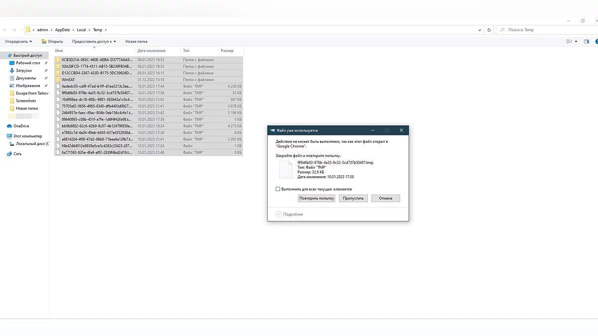- Полностью удалите содержимое папки. Те файлы, которые не удаляются, пропускайте. Они временные, и вы можете не переживать за работоспособность вашей системы.