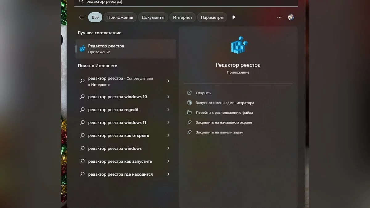 - Нажмите «Поиск» и введите «Редактор реестра» без галочек;
