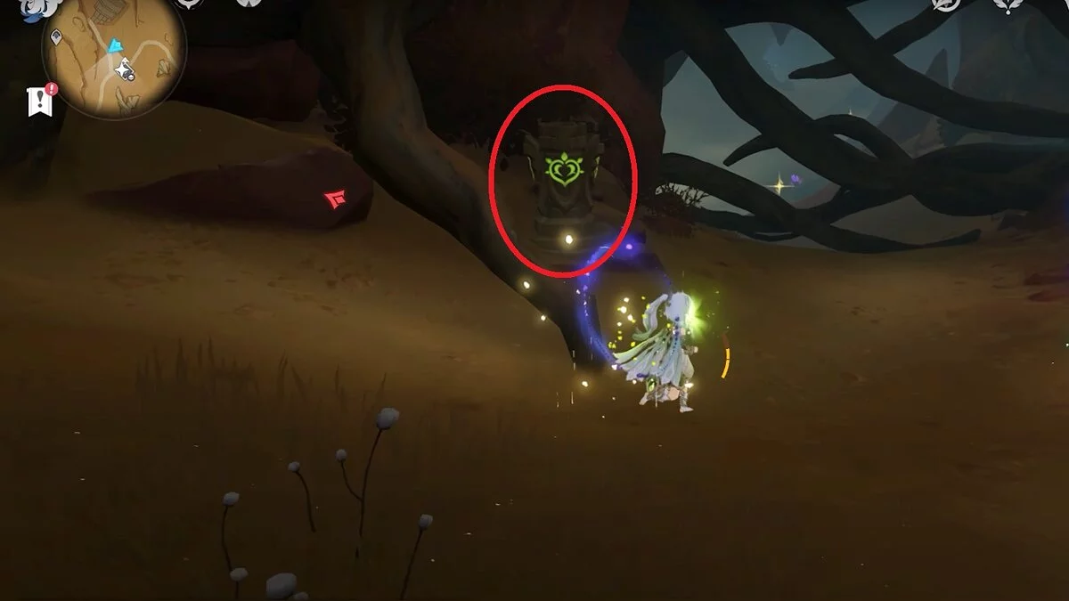 Вы попадёте в просторное помещение. Там вам нужно повернуть налево. Пройдите вперёд и активируйте первые тотем. Вам потребуется Дендро-персонаж.