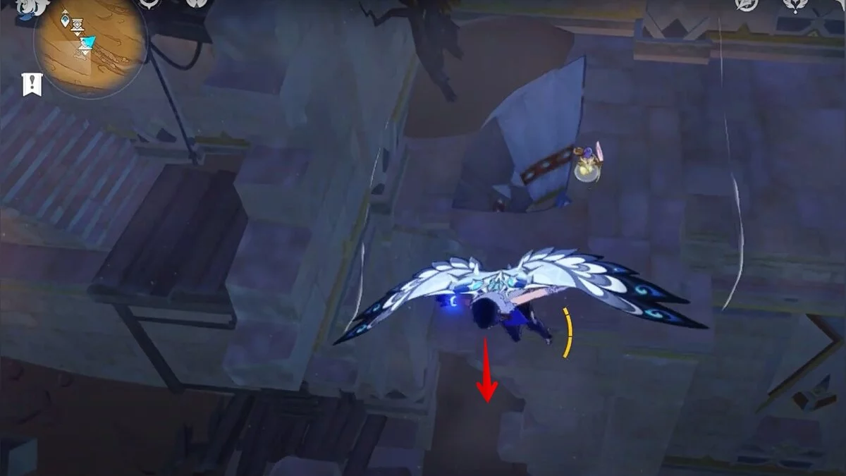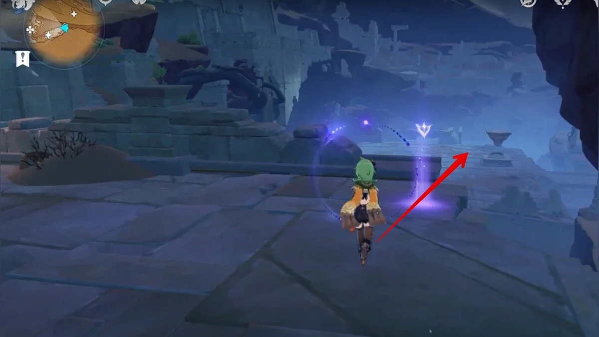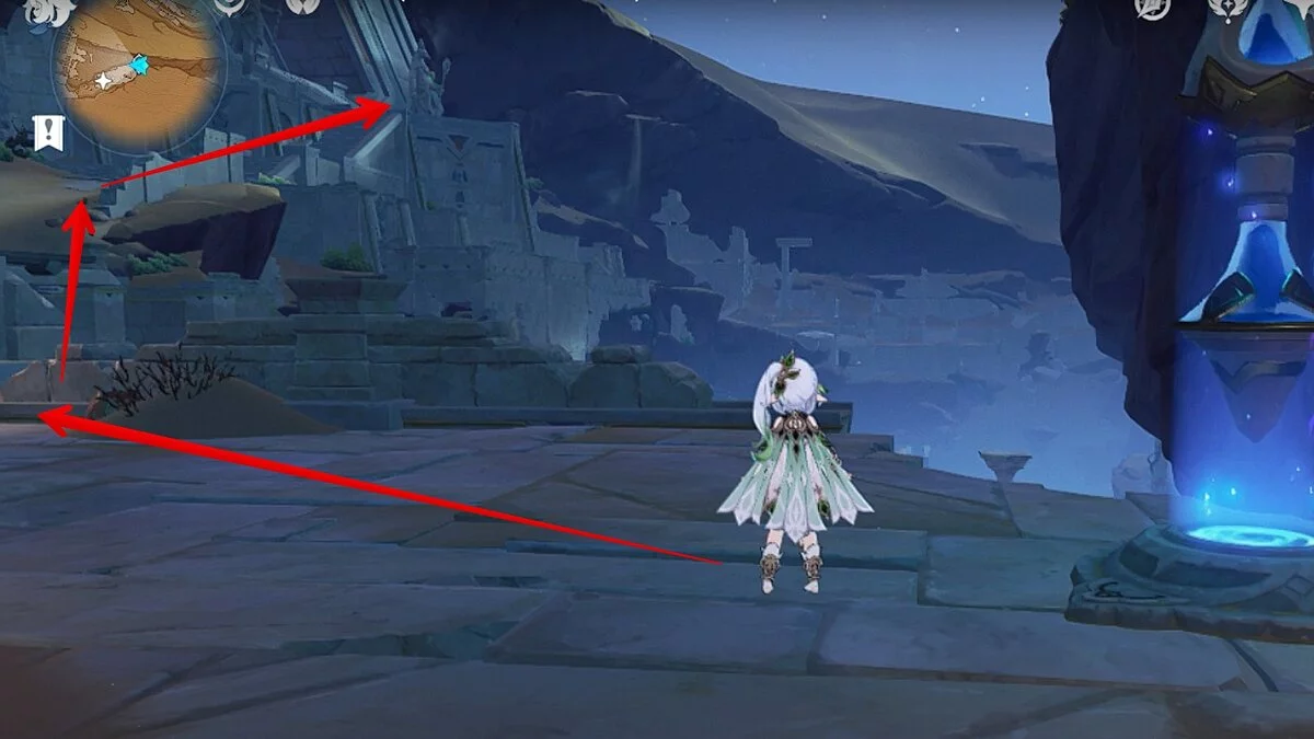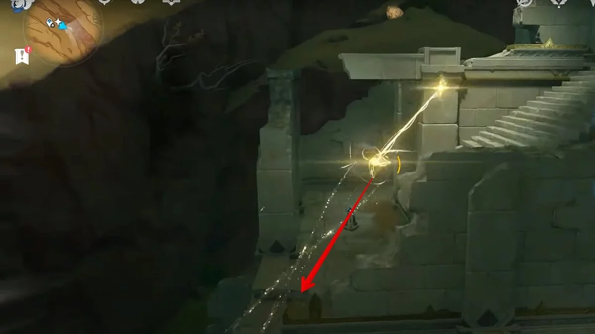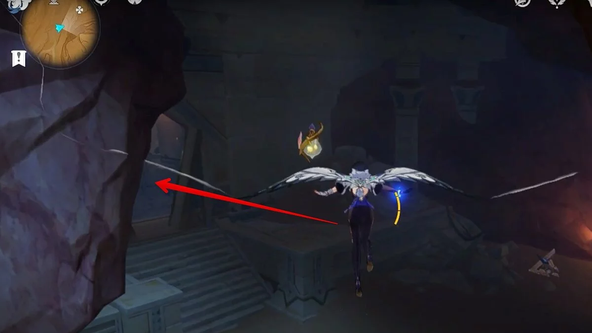 Прыгайте вниз и летите направо. Обелиск возвышается над руинами. Взаимодействуйте с ним, чтобы на вашей карте появилось местоположение скрижалей.
