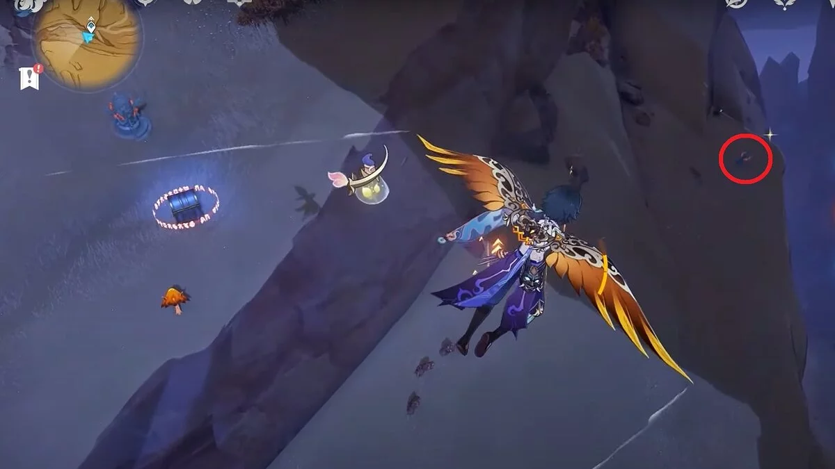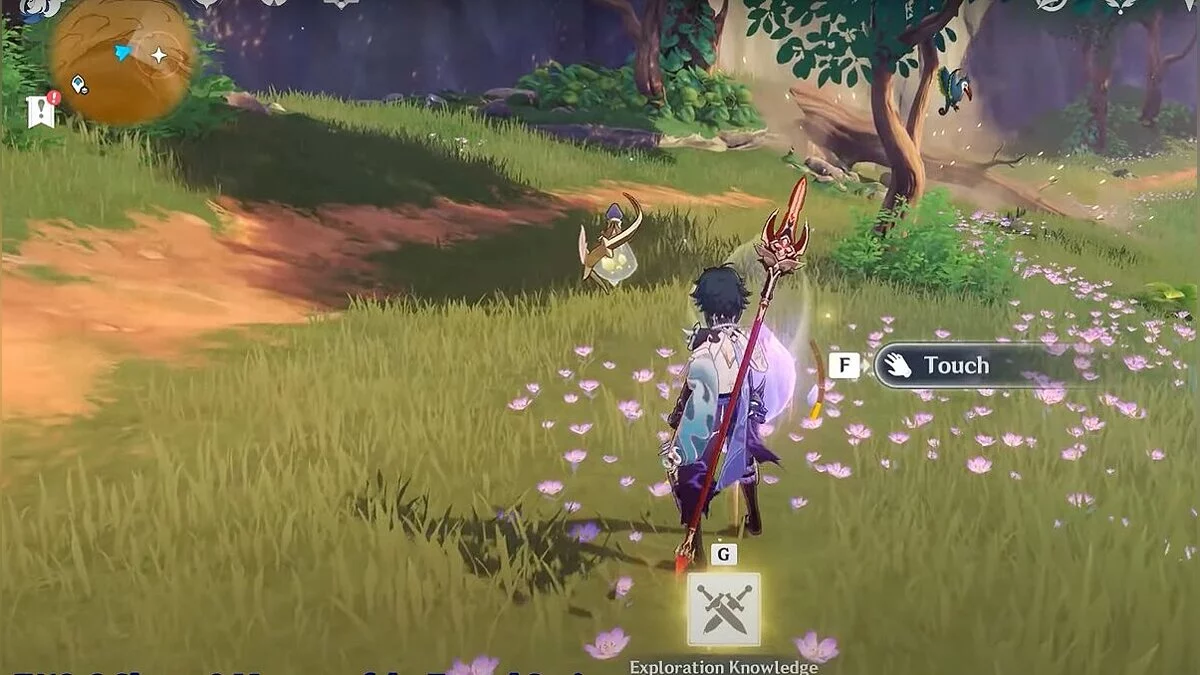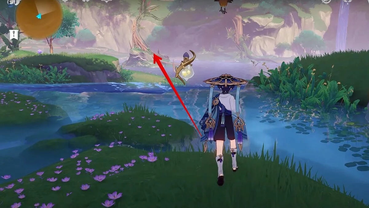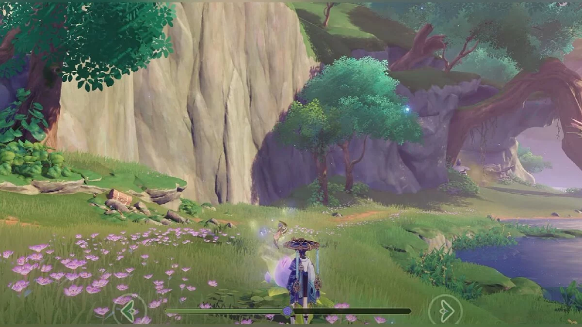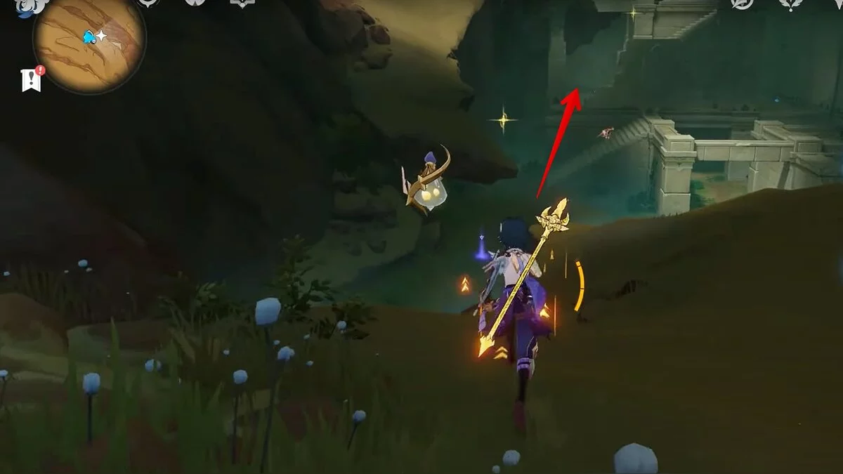 Заберите сундук слева, затем вернитесь к цветку и коснитесь его снова. Он полетит вперёд. Следуйте за ним.
