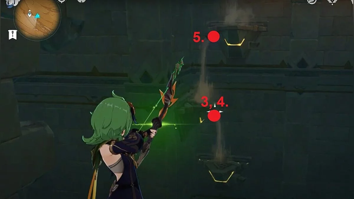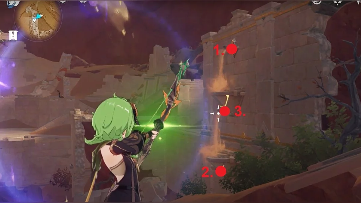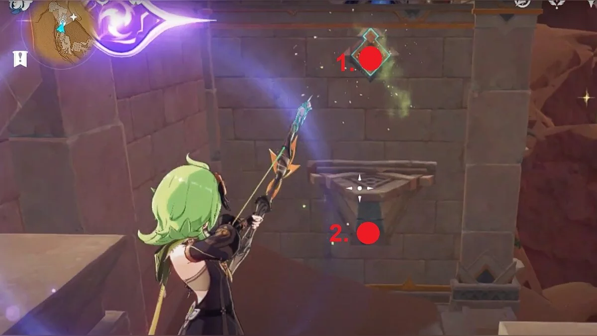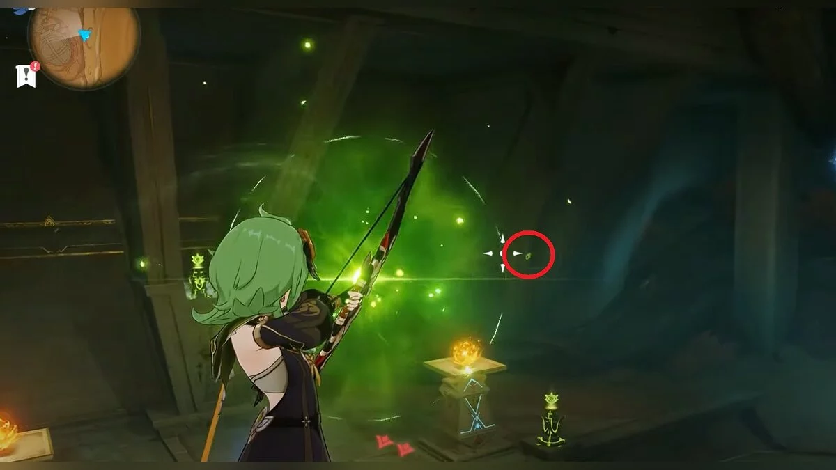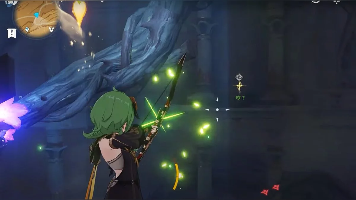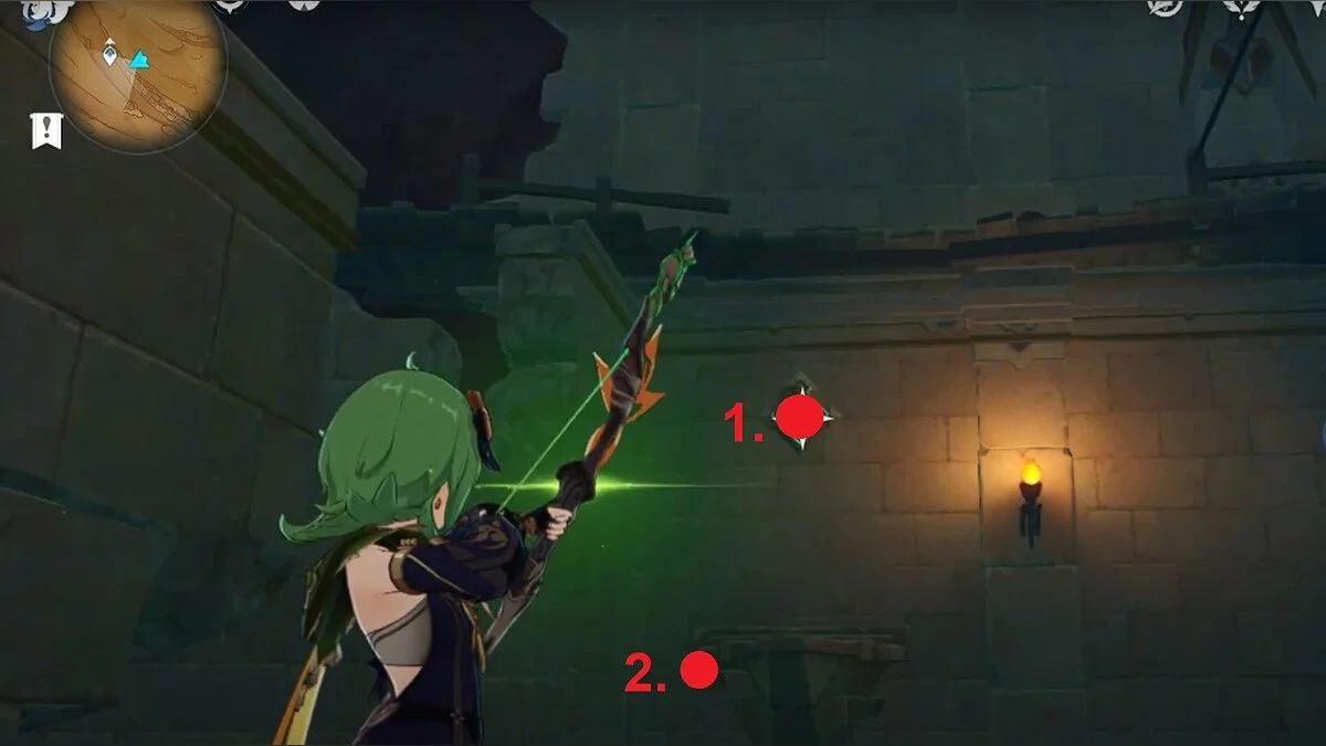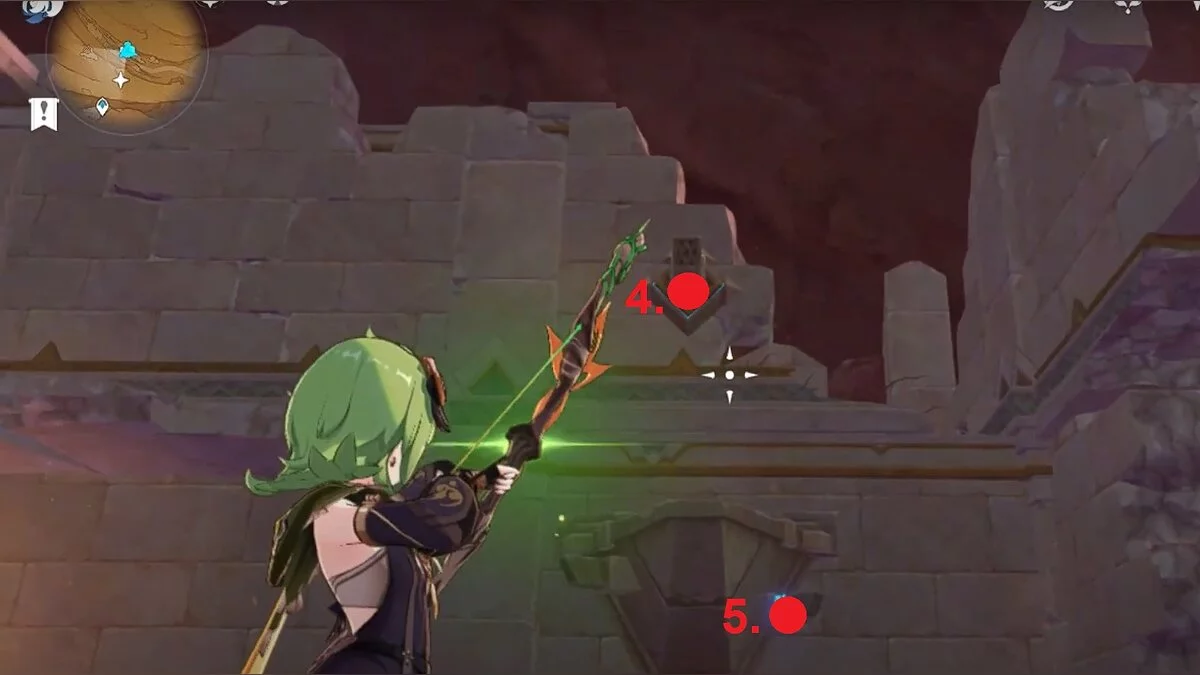 Останется ударить по тотемам Дендро-атакой. Обратите внимание на то, что их не два, а пять. Ещё три штуки находятся на стене. Их местоположение мы указали на скриншотах. Займите позицию на ветке, переключитесь на Дендро-лучника и расстреляйте тотемы.