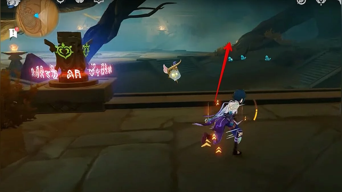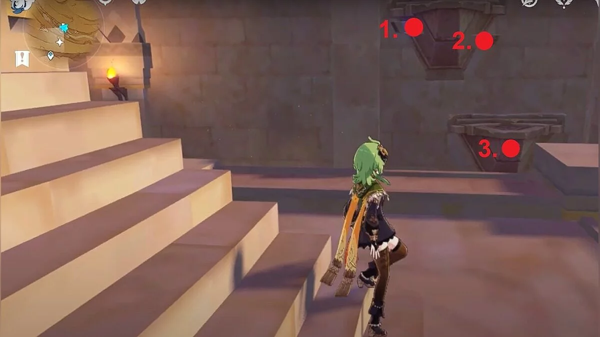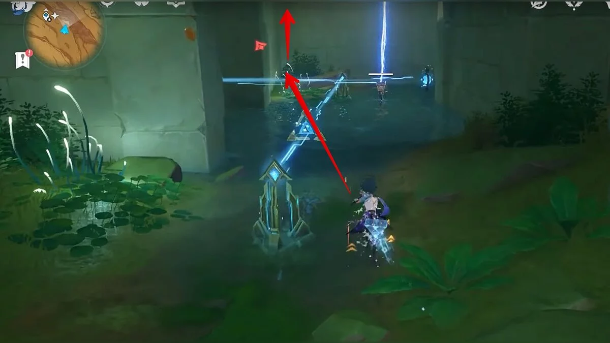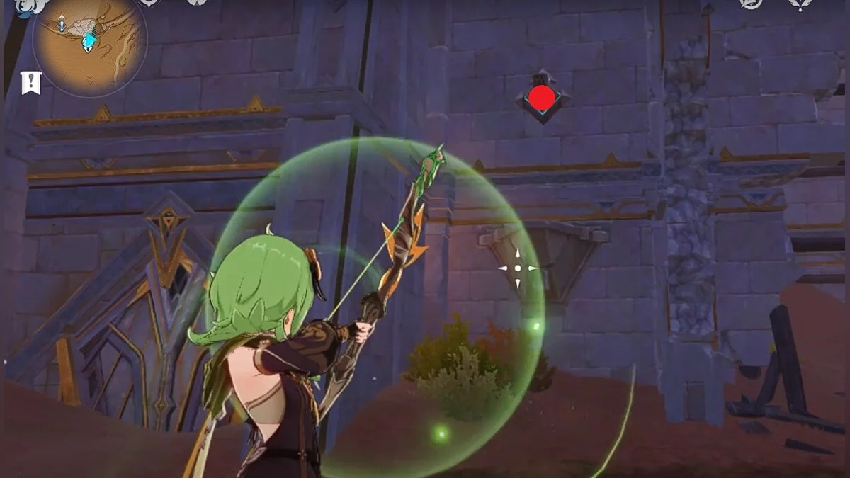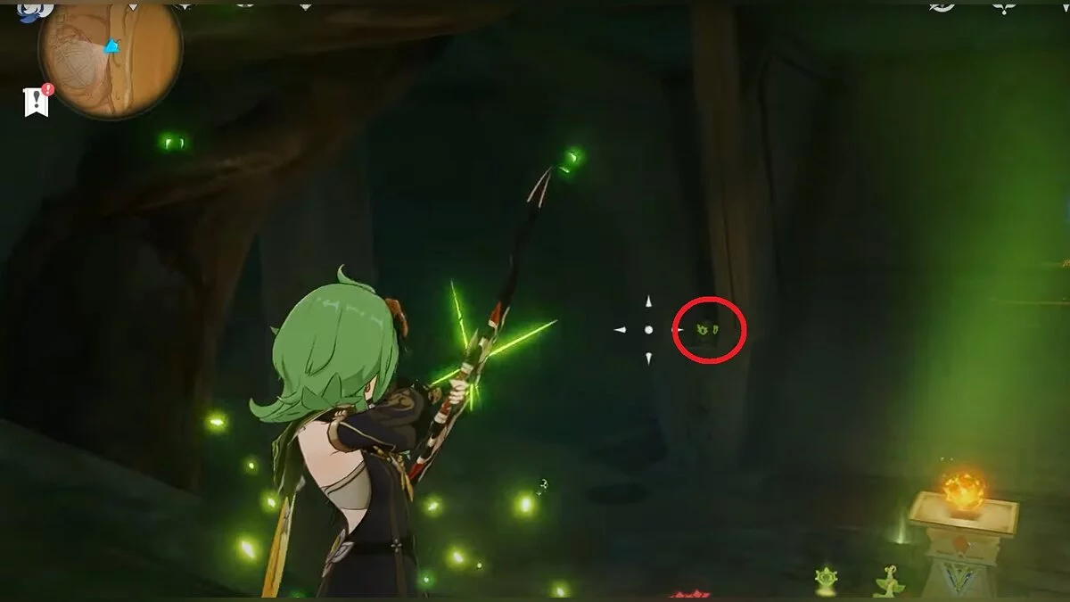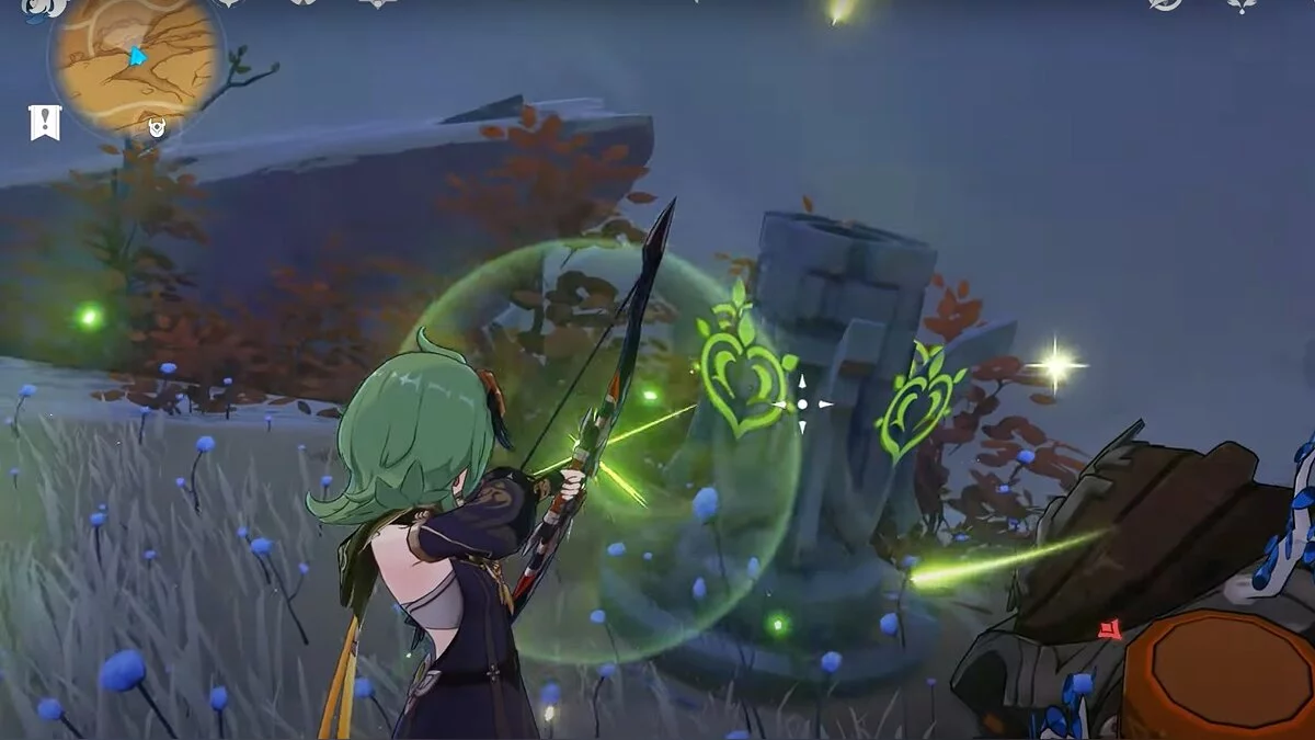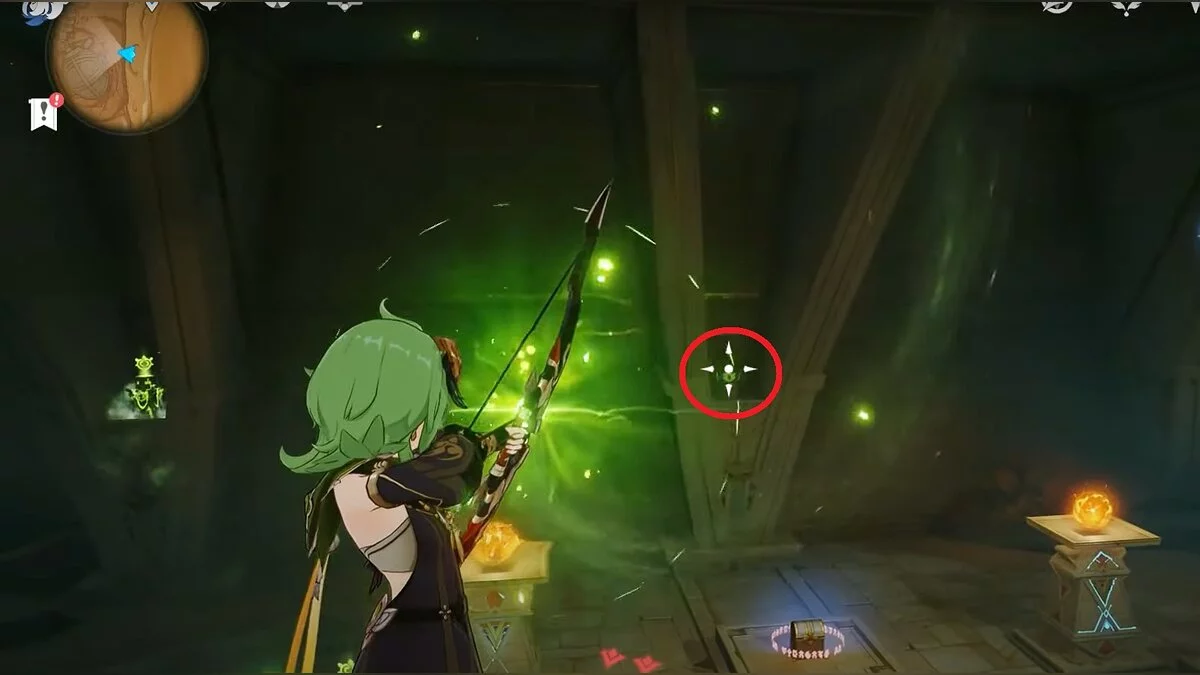 Останется ударить по тотемам Дендро-атакой. Обратите внимание на то, что их не два, а пять. Ещё три штуки находятся на стене. Их местоположение мы указали на скриншотах. Займите позицию на ветке, переключитесь на Дендро-лучника и расстреляйте тотемы.