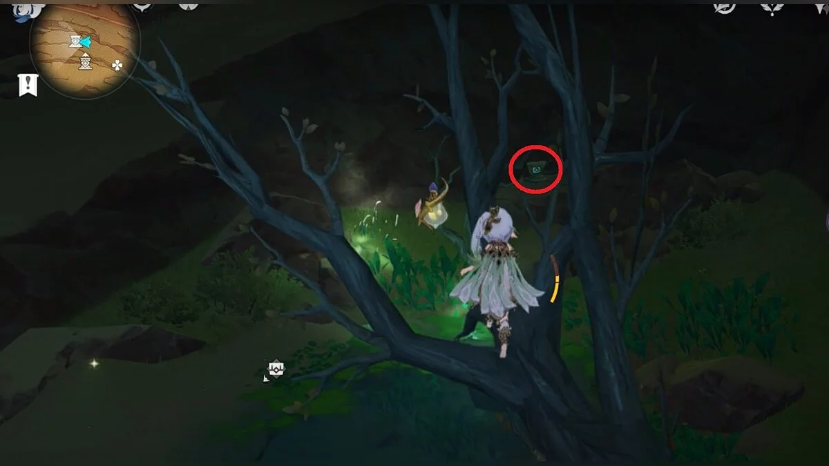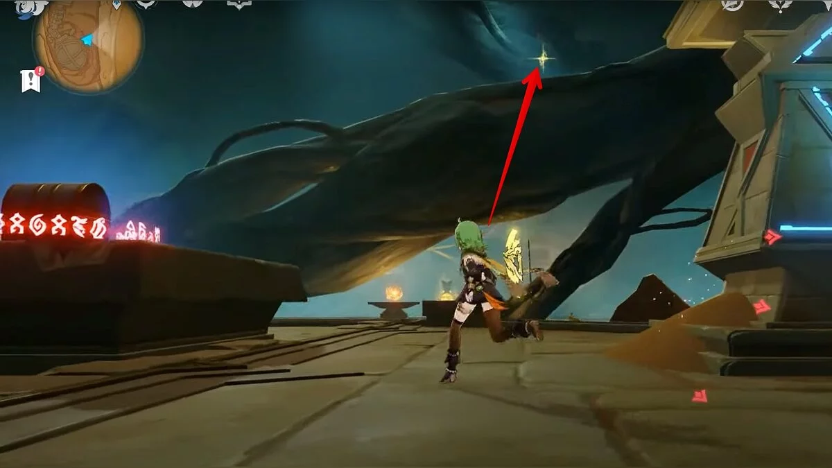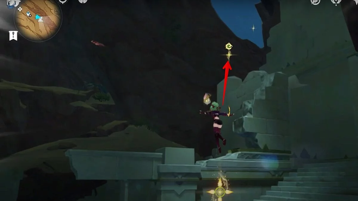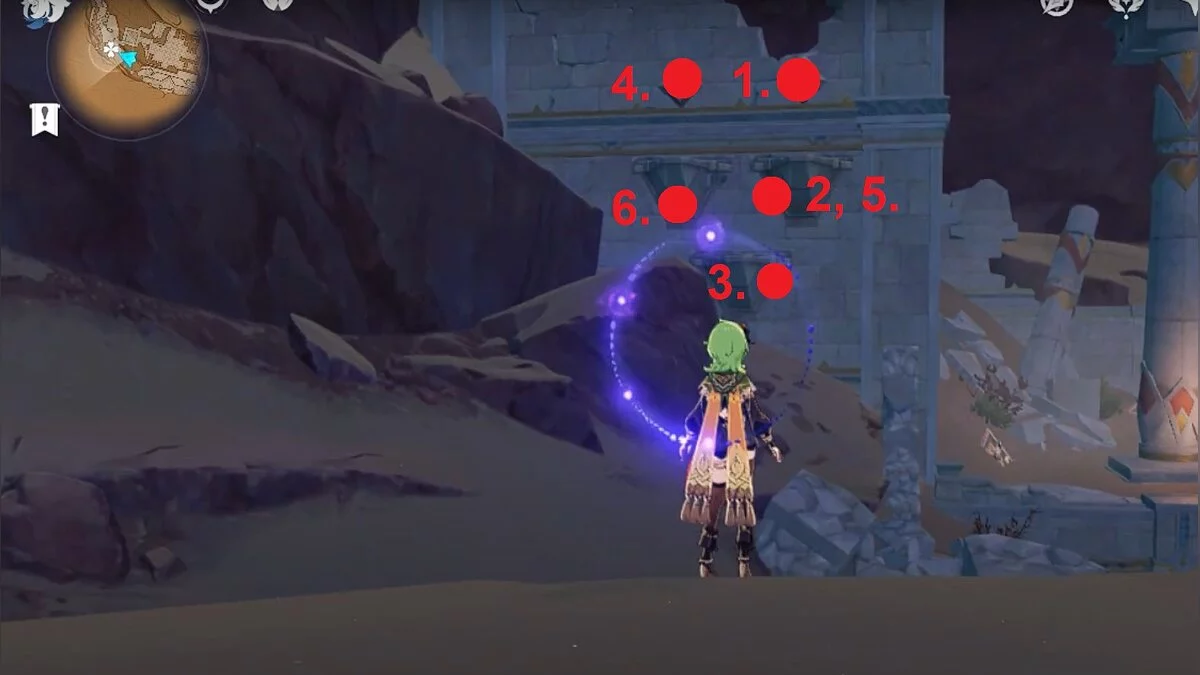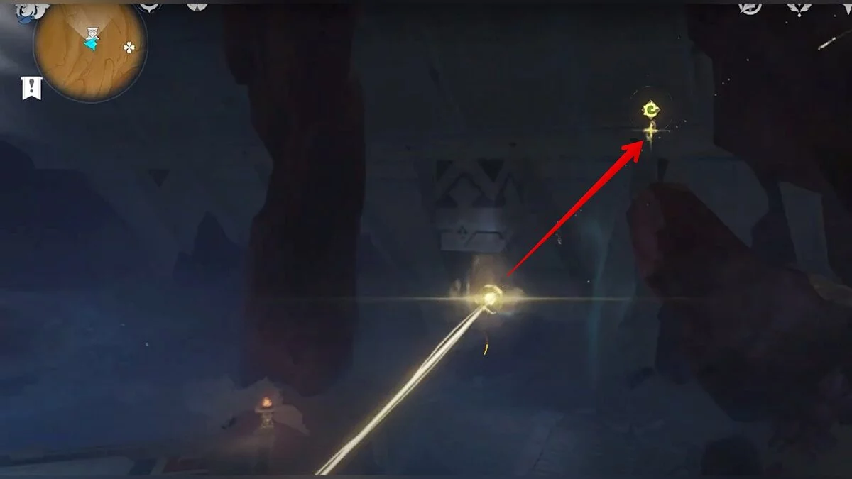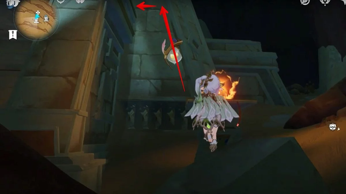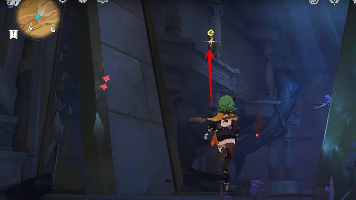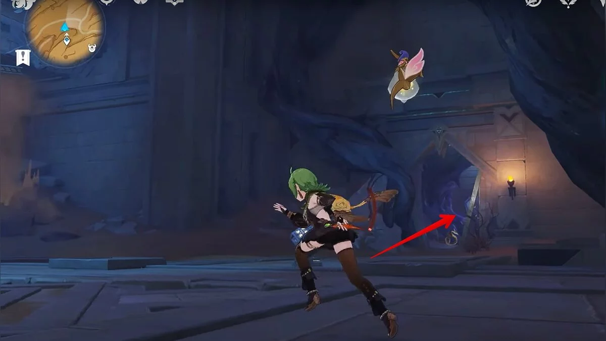 Останется ударить по тотемам Дендро-атакой. Обратите внимание на то, что их не два, а пять. Ещё три штуки находятся на стене. Их местоположение мы указали на скриншотах. Займите позицию на ветке, переключитесь на Дендро-лучника и расстреляйте тотемы.