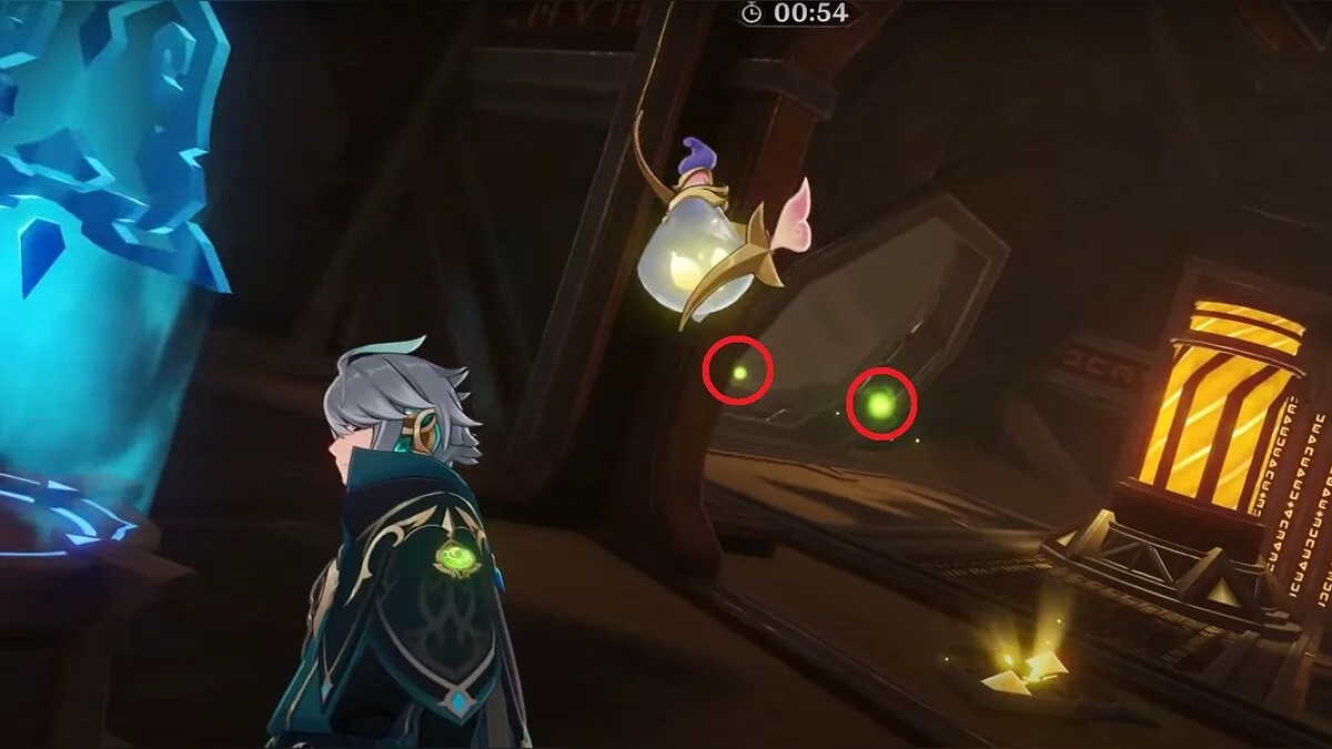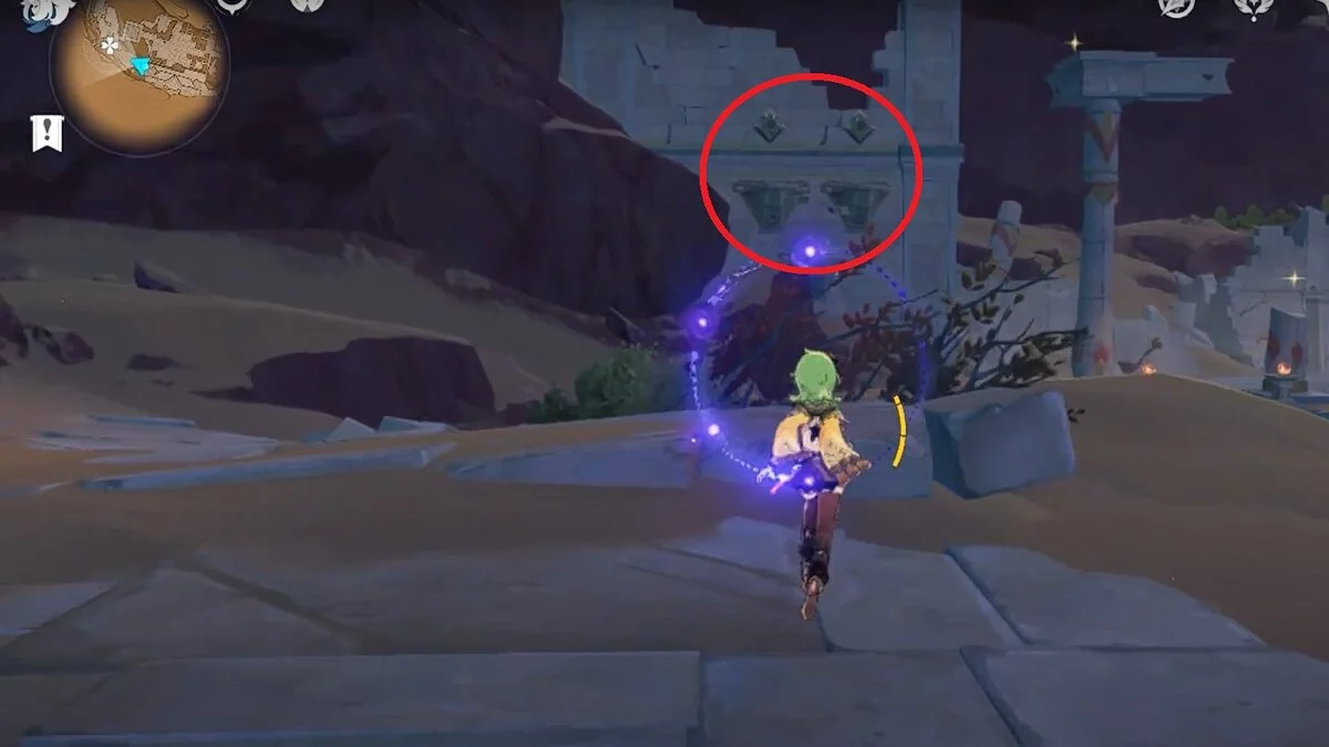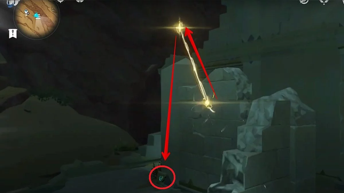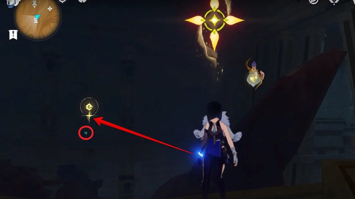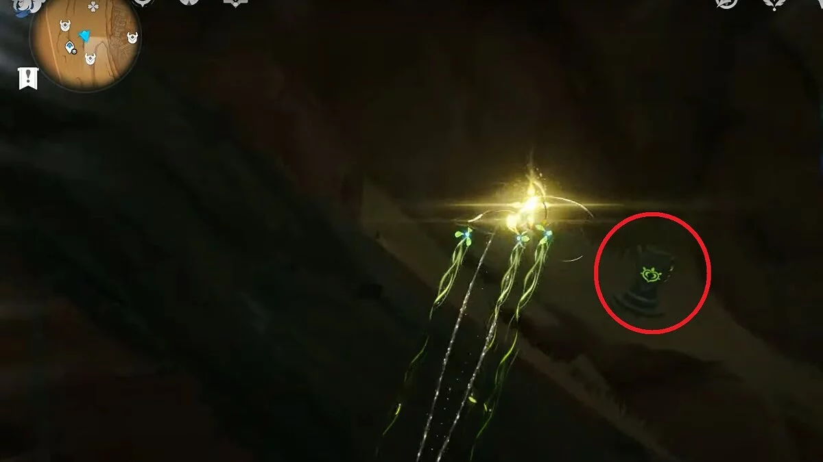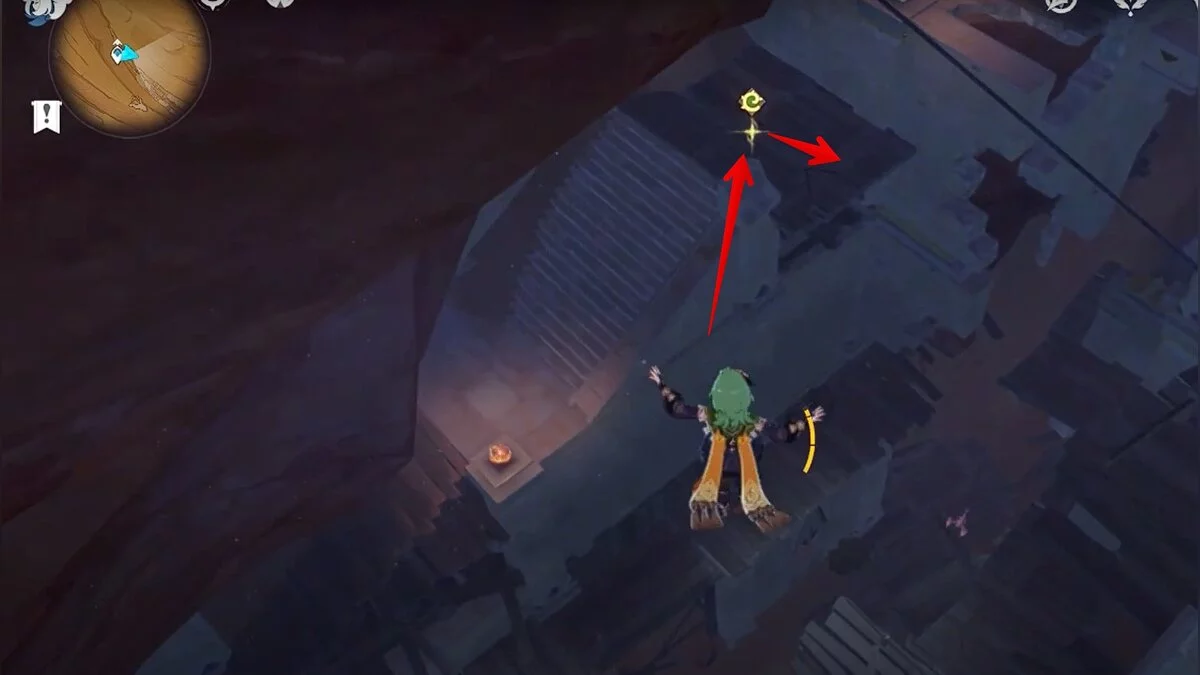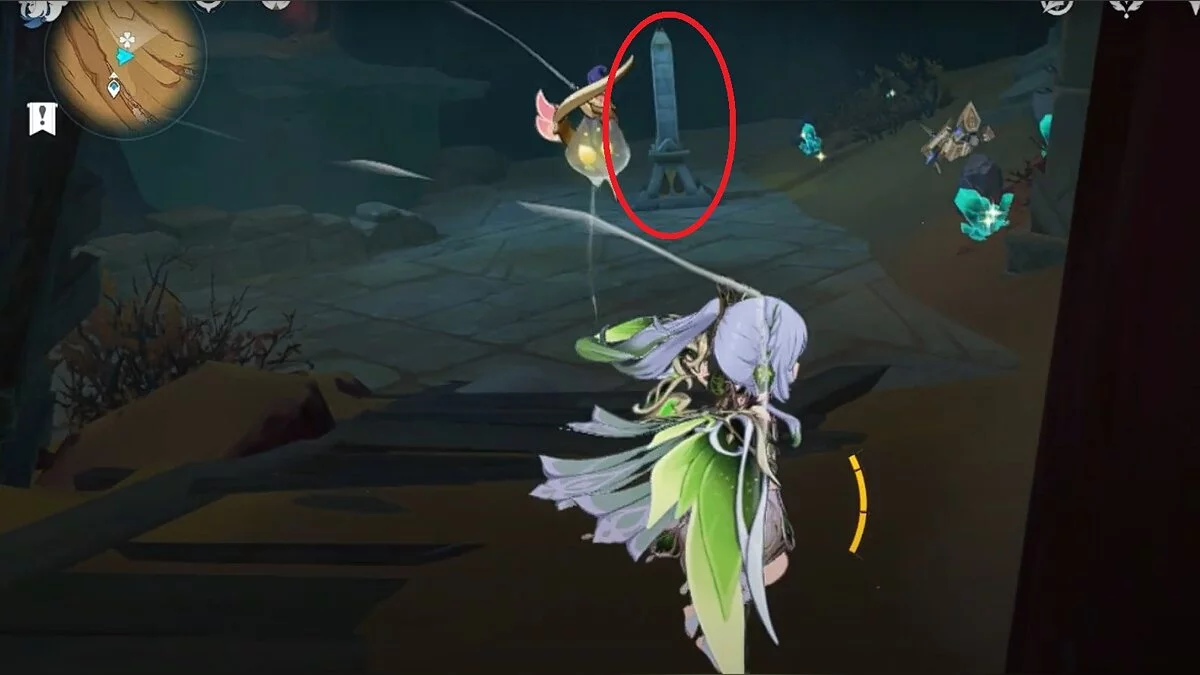 Останется ударить по тотемам Дендро-атакой. Обратите внимание на то, что их не два, а пять. Ещё три штуки находятся на стене. Их местоположение мы указали на скриншотах. Займите позицию на ветке, переключитесь на Дендро-лучника и расстреляйте тотемы.