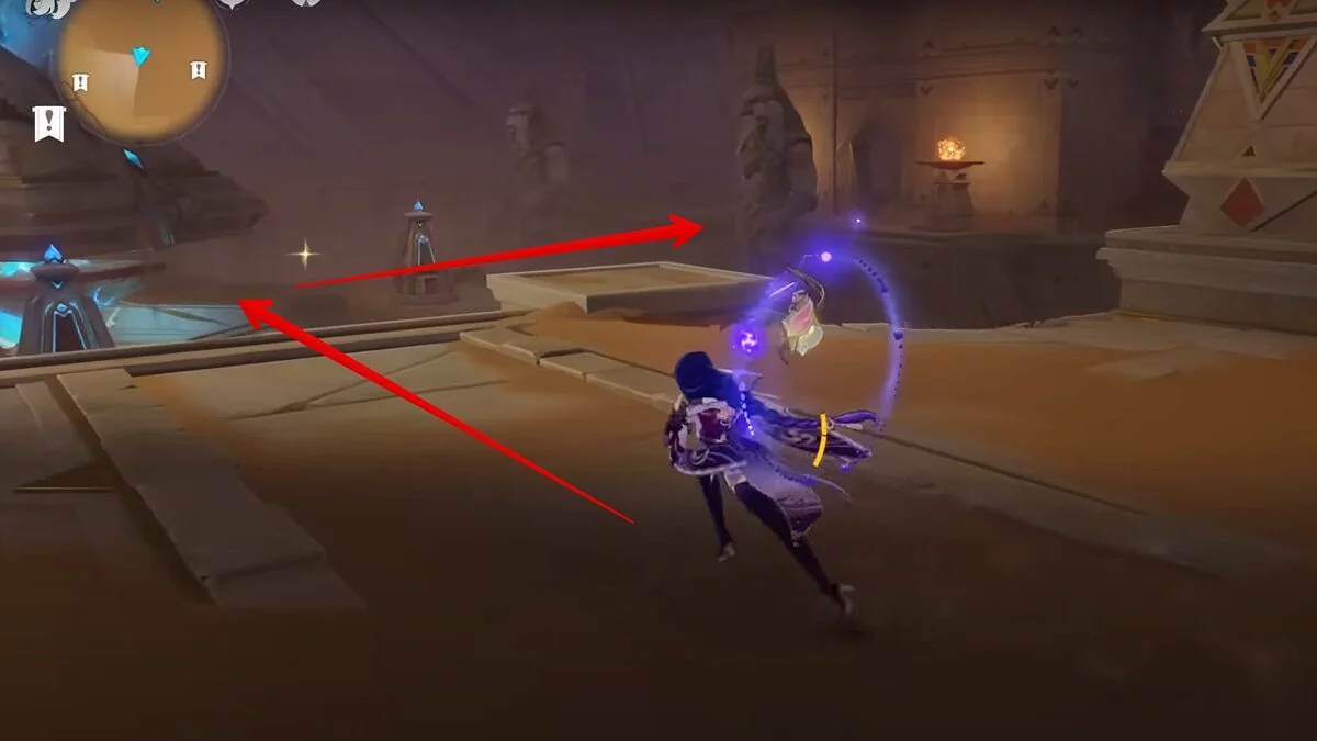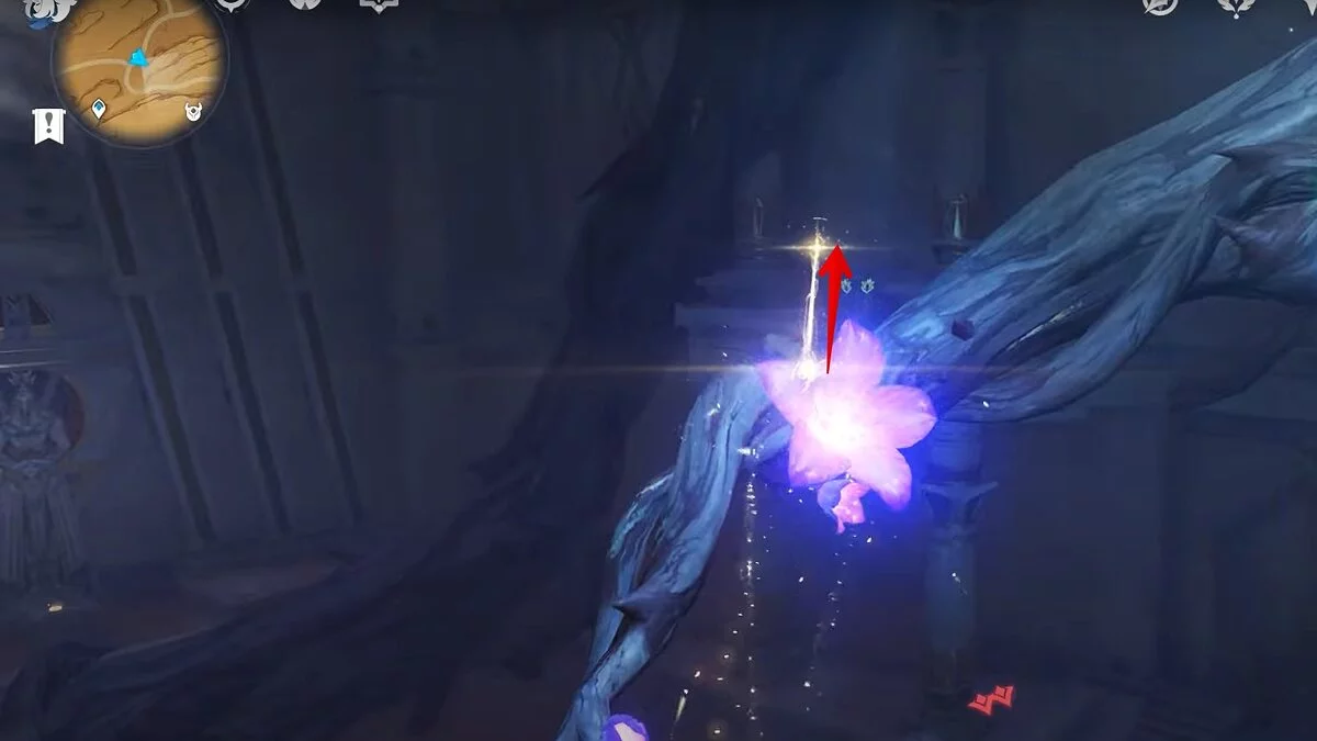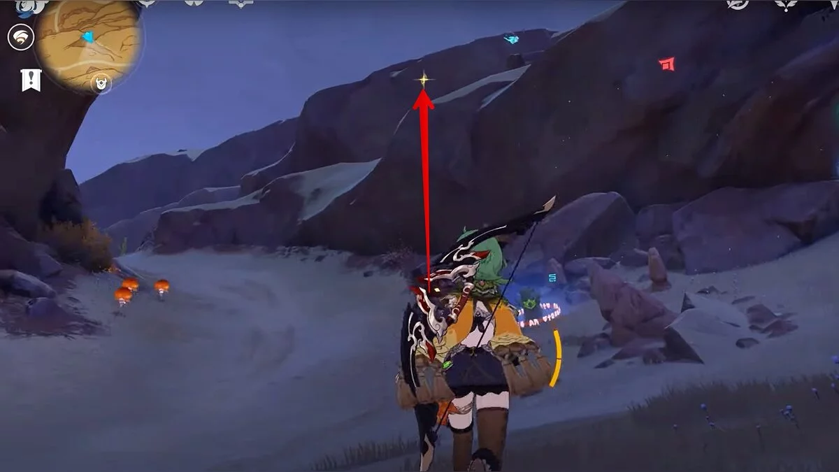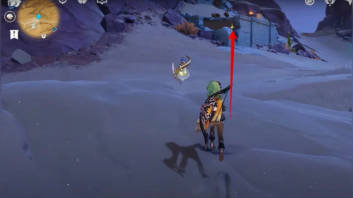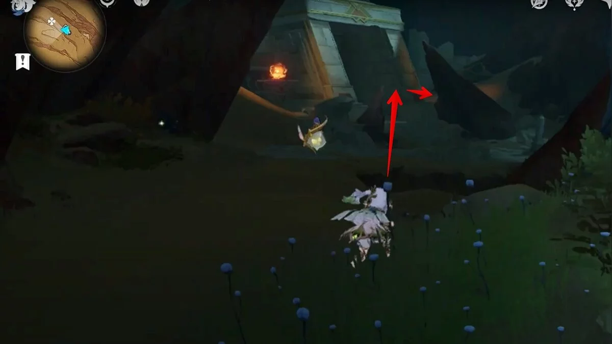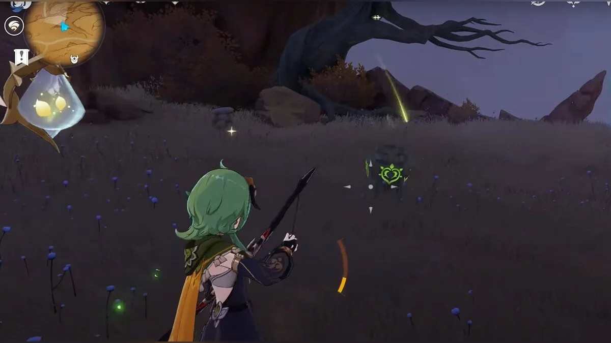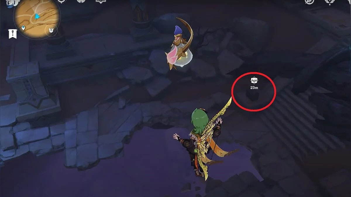 Останется ударить по тотемам Дендро-атакой. Обратите внимание на то, что их не два, а пять. Ещё три штуки находятся на стене. Их местоположение мы указали на скриншотах. Займите позицию на ветке, переключитесь на Дендро-лучника и расстреляйте тотемы.