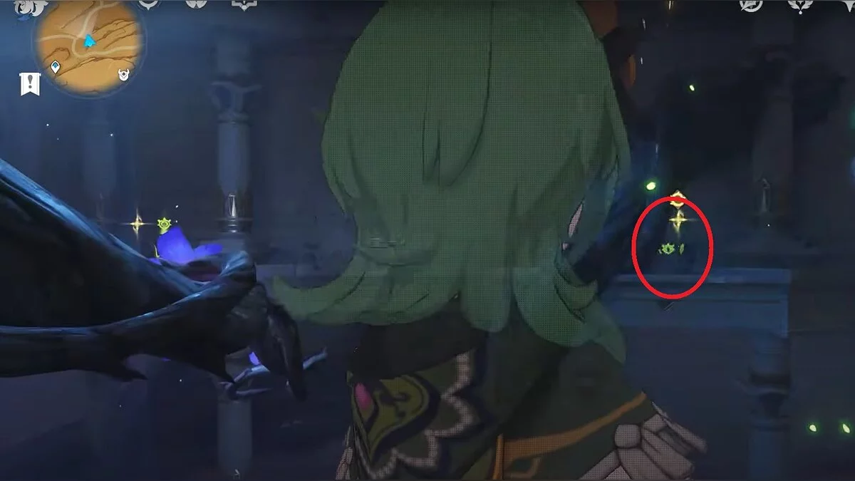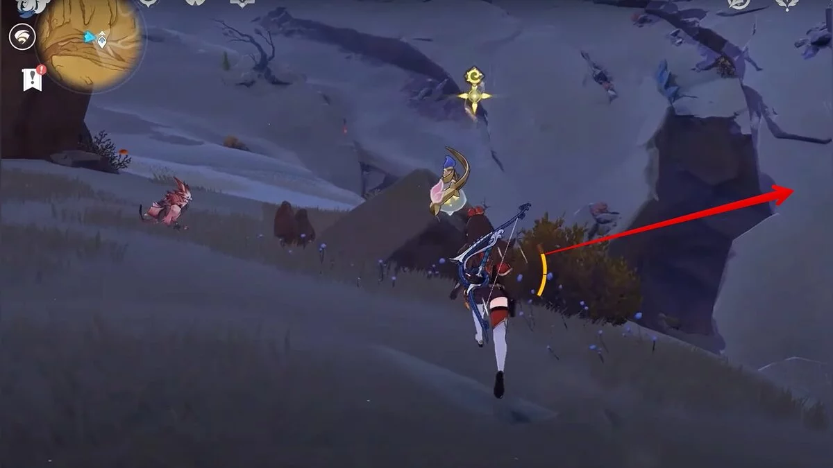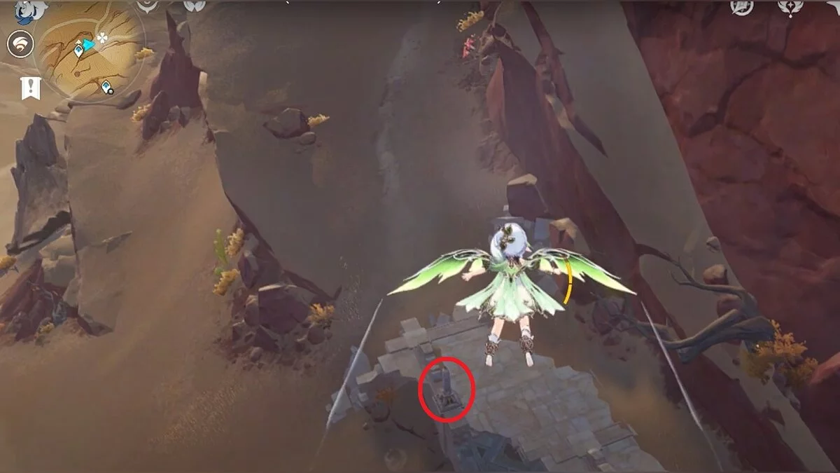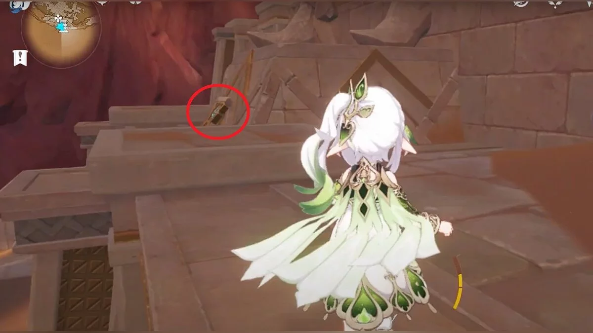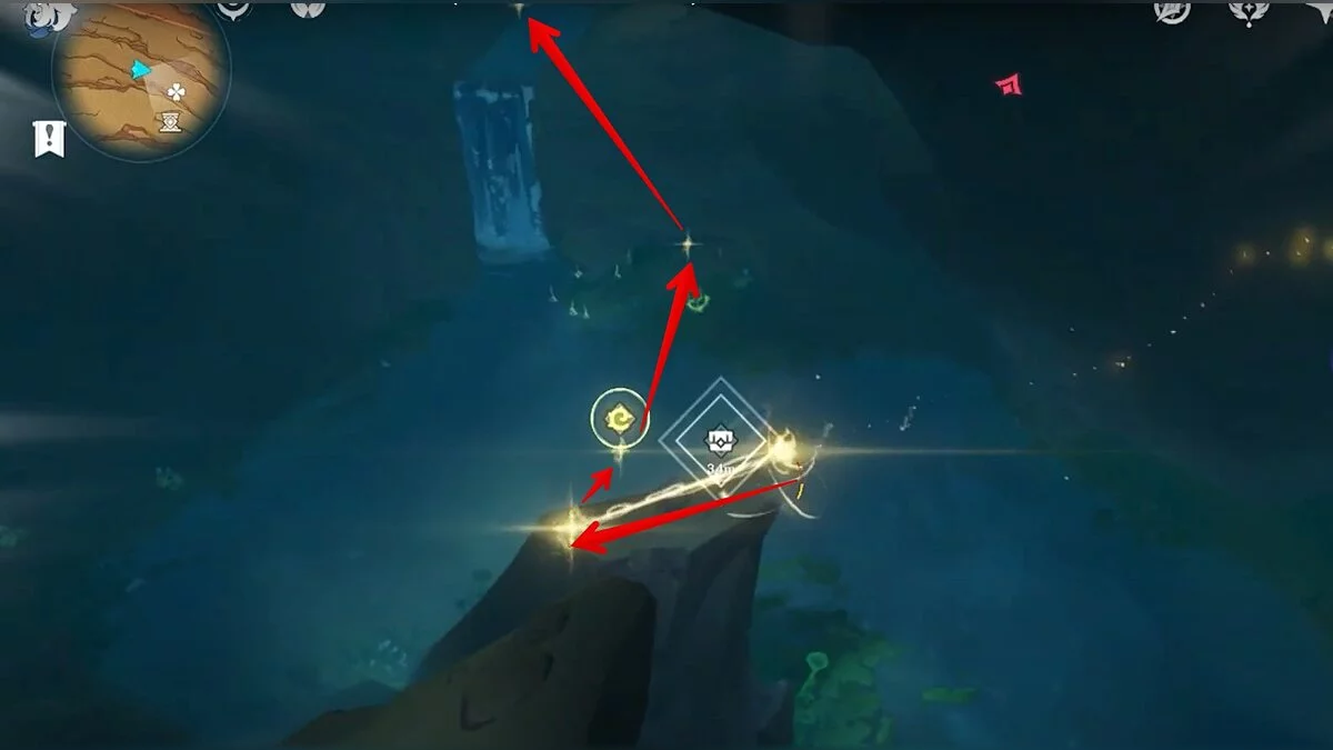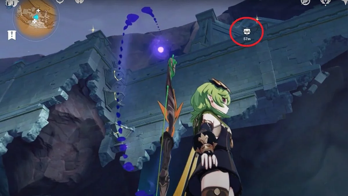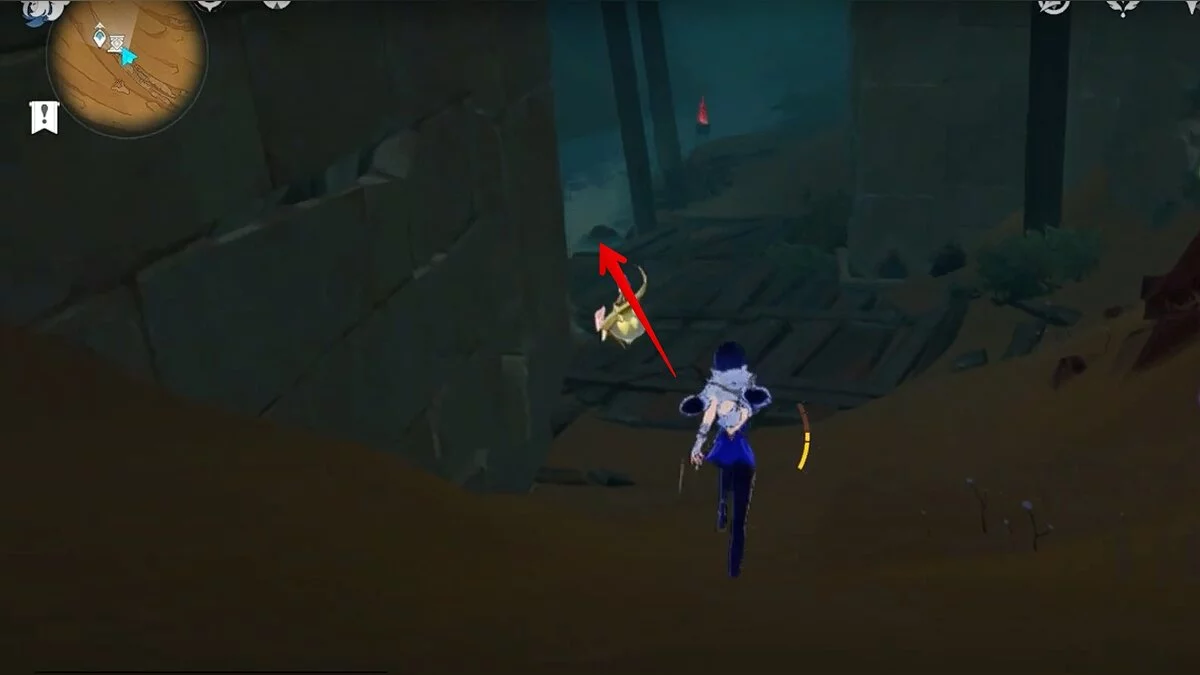 Останется ударить по тотемам Дендро-атакой. Обратите внимание на то, что их не два, а пять. Ещё три штуки находятся на стене. Их местоположение мы указали на скриншотах. Займите позицию на ветке, переключитесь на Дендро-лучника и расстреляйте тотемы.