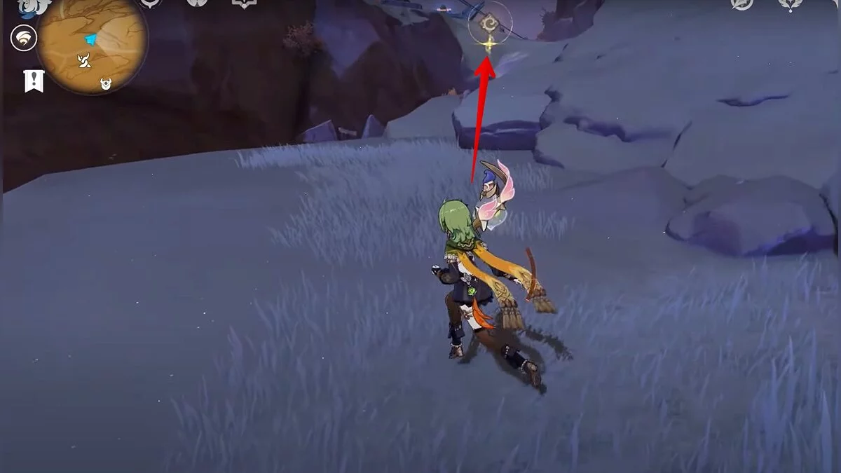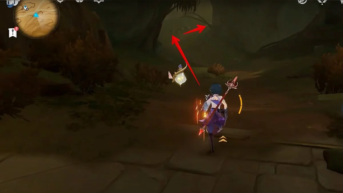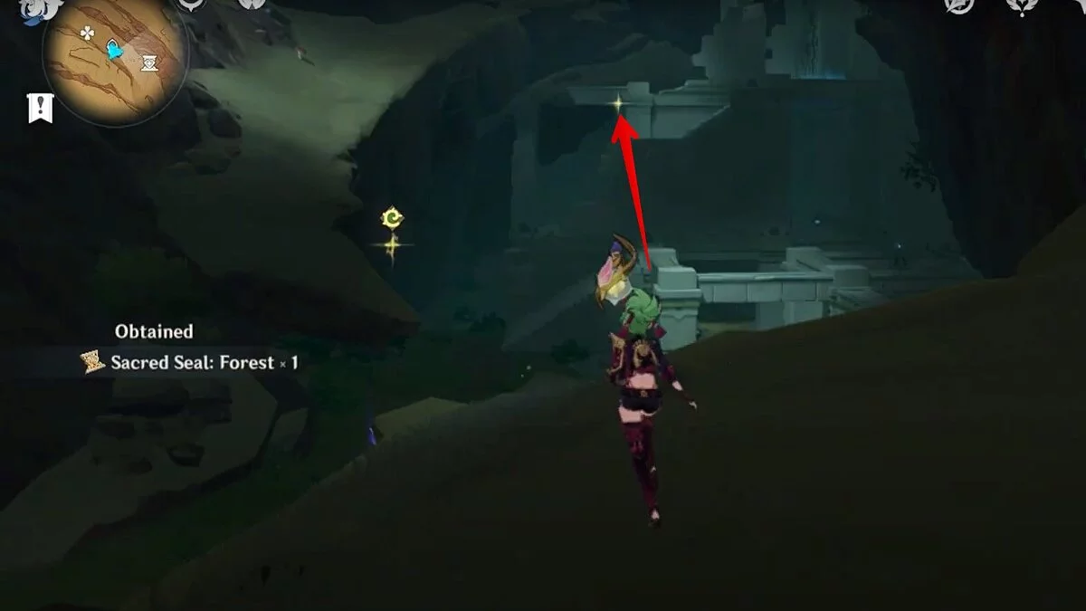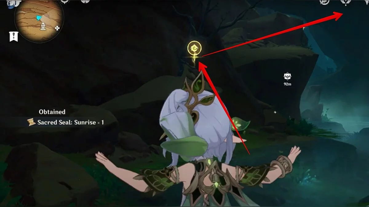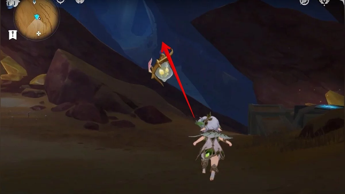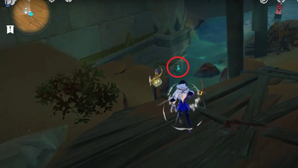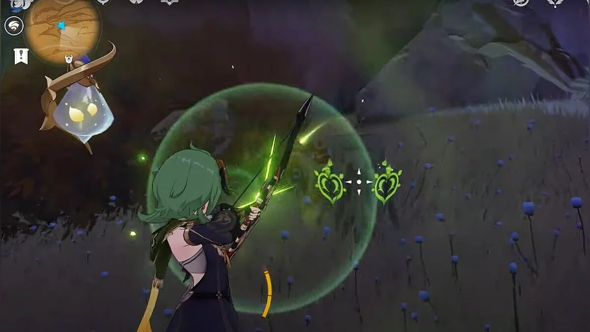 Останется ударить по тотемам Дендро-атакой. Обратите внимание на то, что их не два, а пять. Ещё три штуки находятся на стене. Их местоположение мы указали на скриншотах. Займите позицию на ветке, переключитесь на Дендро-лучника и расстреляйте тотемы.