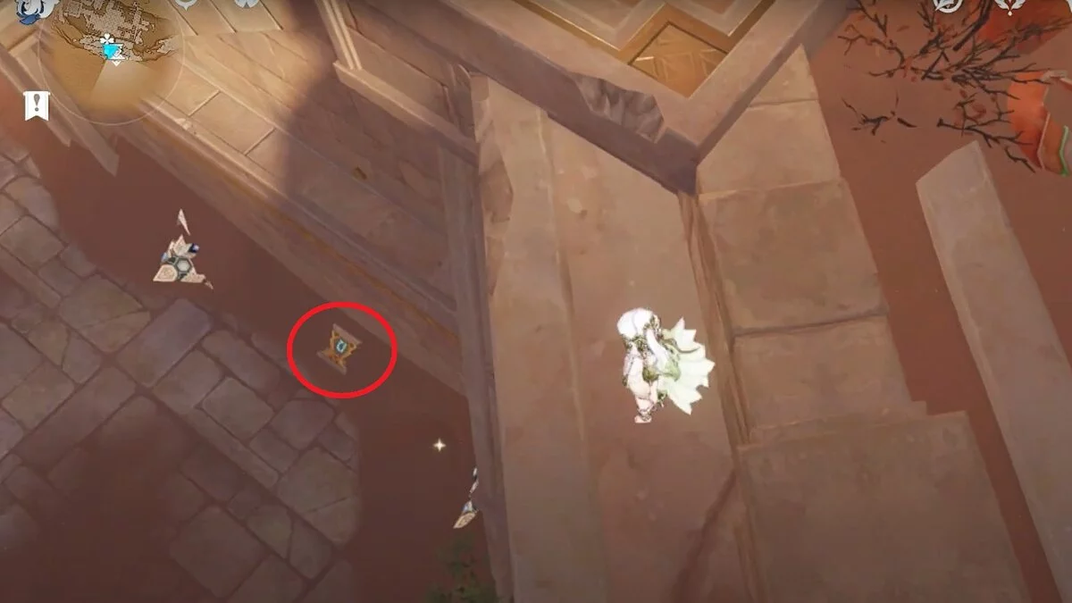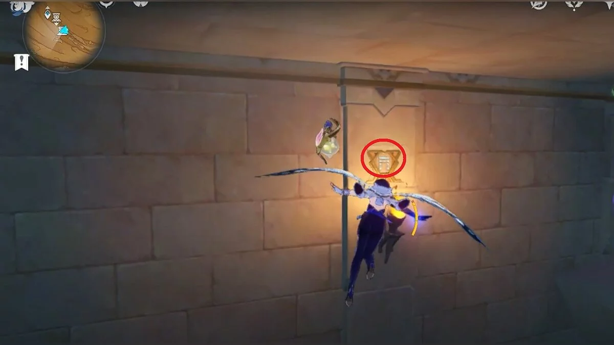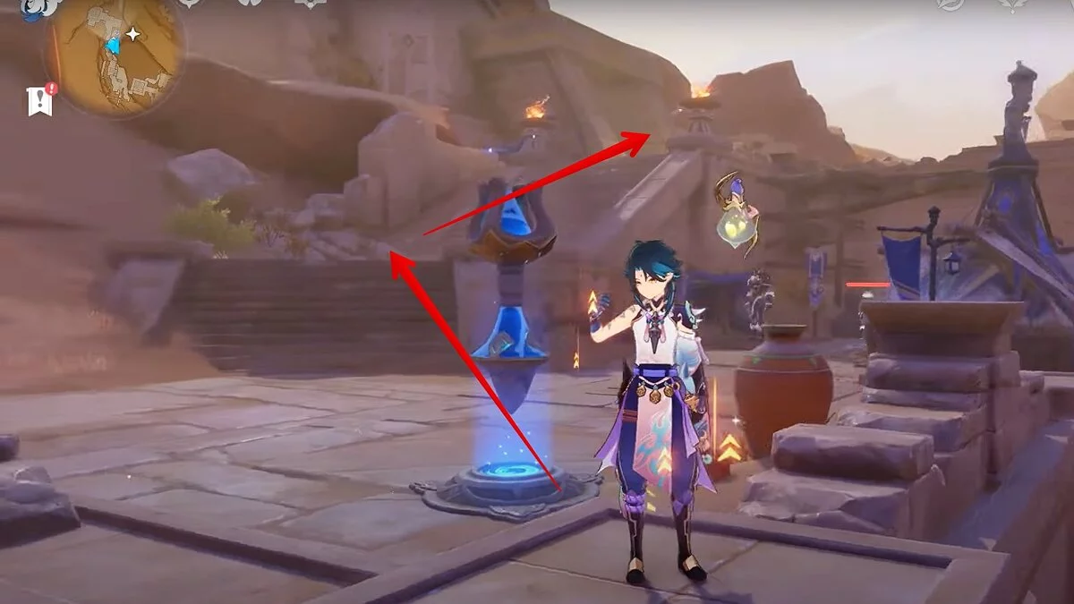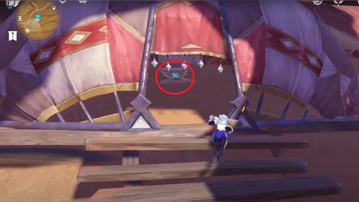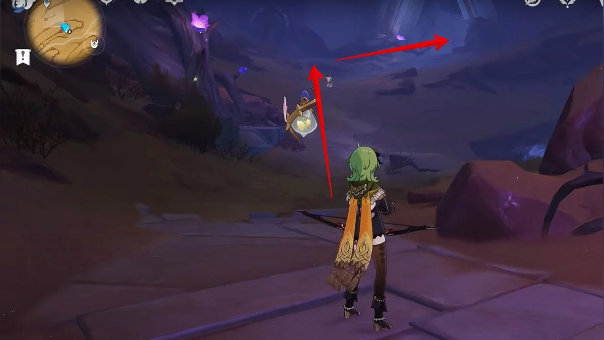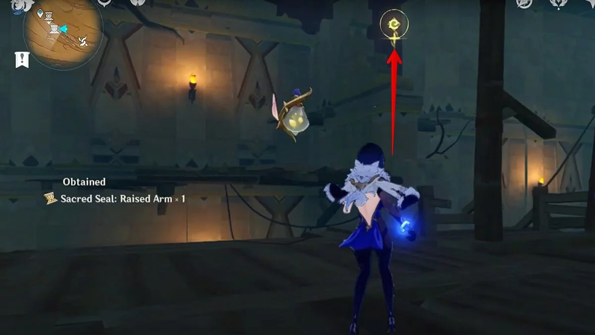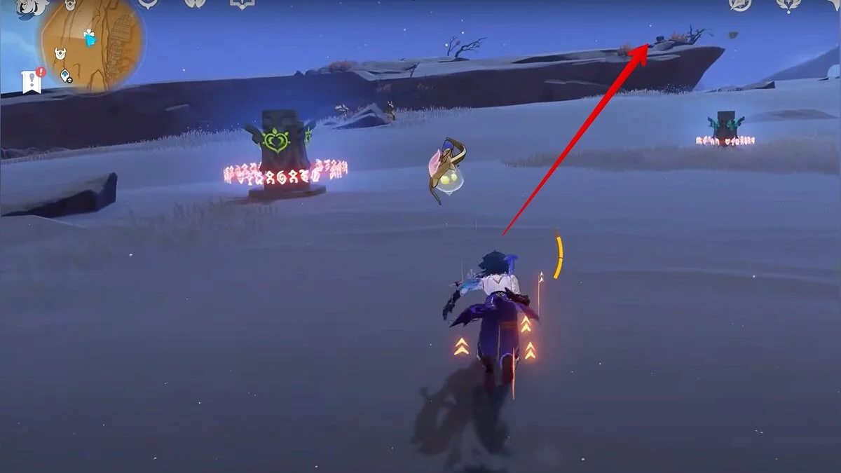 Останется ударить по тотемам Дендро-атакой. Обратите внимание на то, что их не два, а пять. Ещё три штуки находятся на стене. Их местоположение мы указали на скриншотах. Займите позицию на ветке, переключитесь на Дендро-лучника и расстреляйте тотемы.