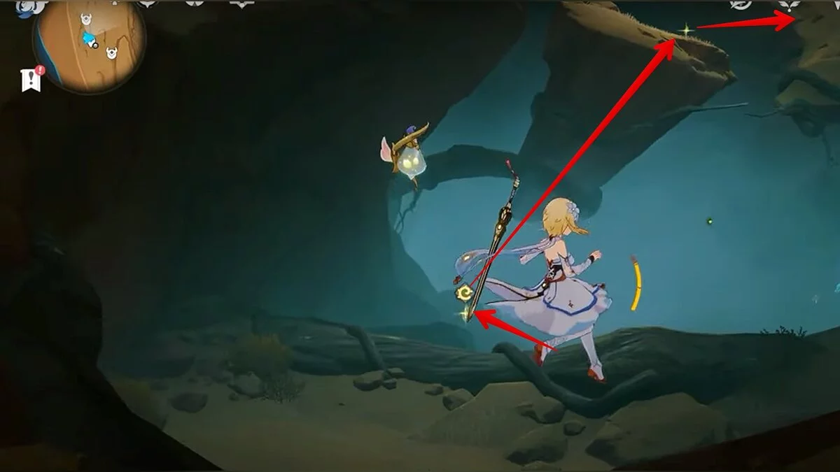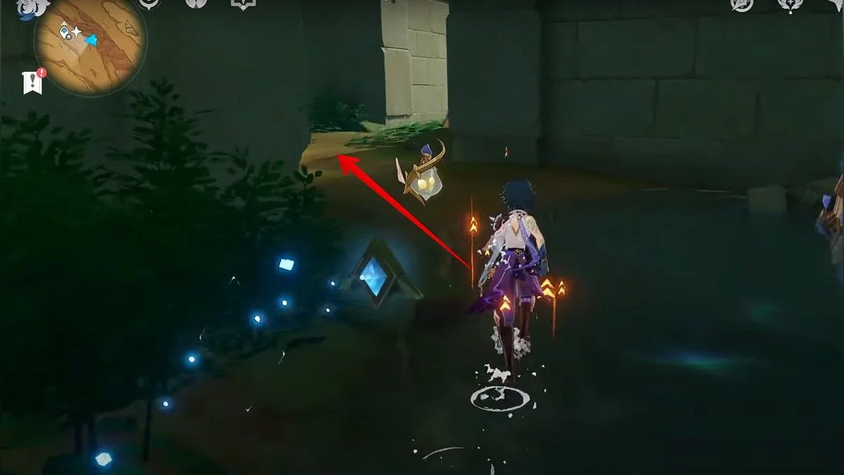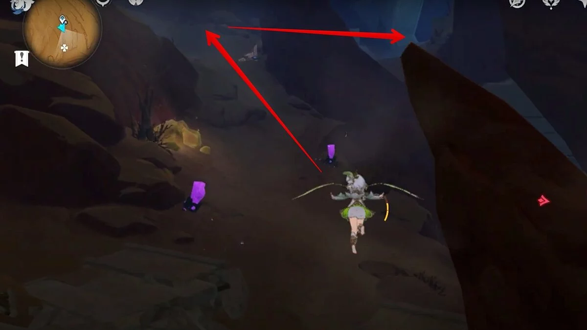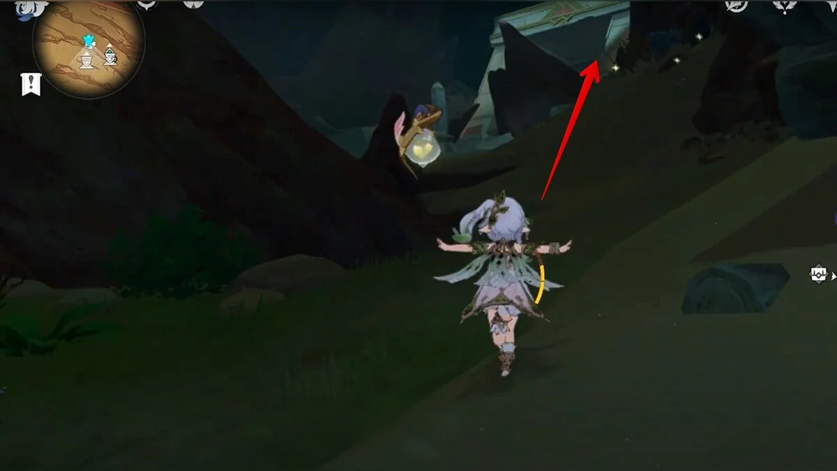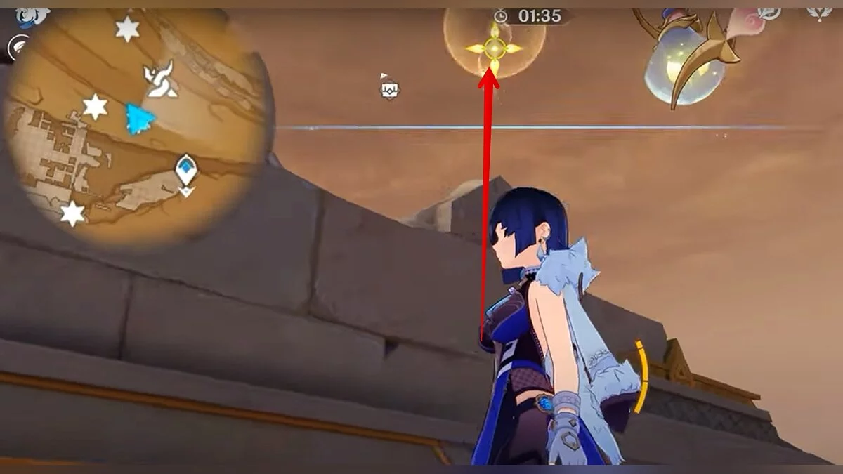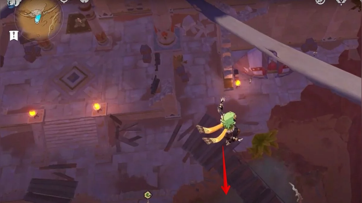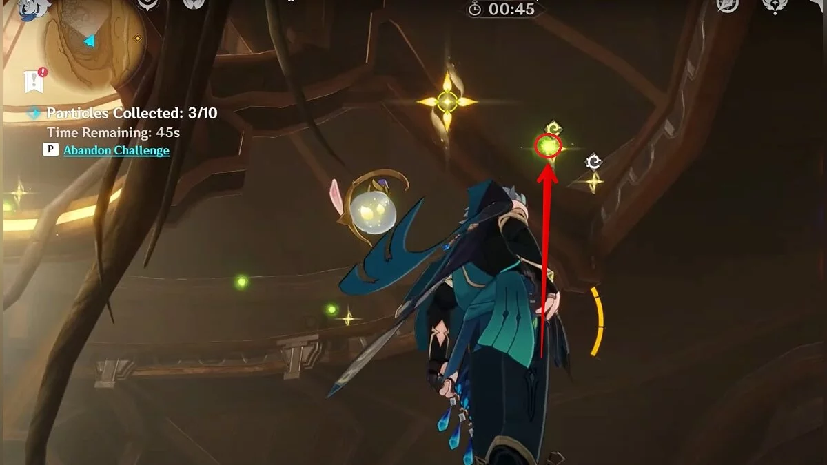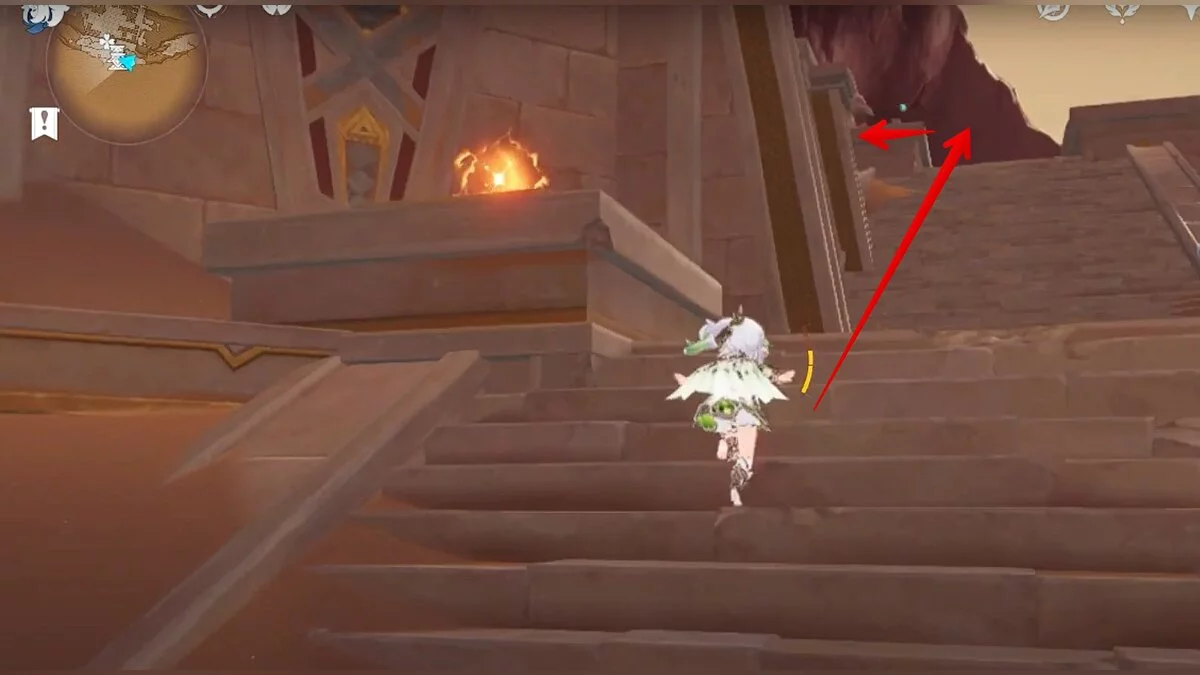 Останется ударить по тотемам Дендро-атакой. Обратите внимание на то, что их не два, а пять. Ещё три штуки находятся на стене. Их местоположение мы указали на скриншотах. Займите позицию на ветке, переключитесь на Дендро-лучника и расстреляйте тотемы.
