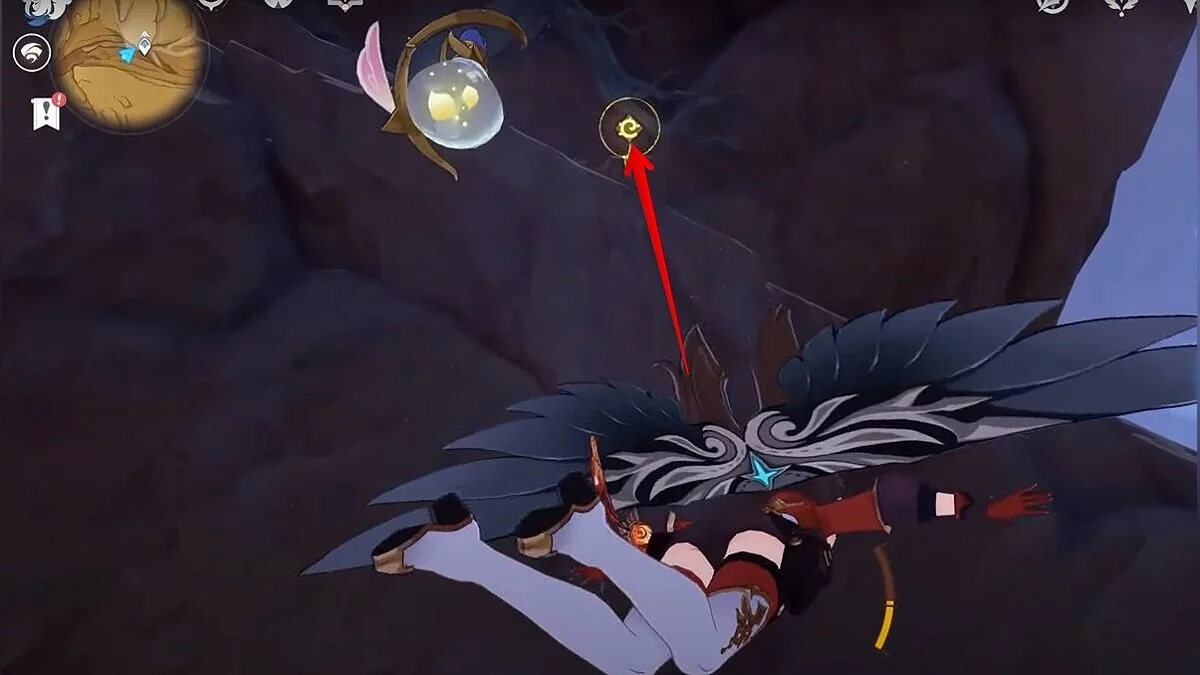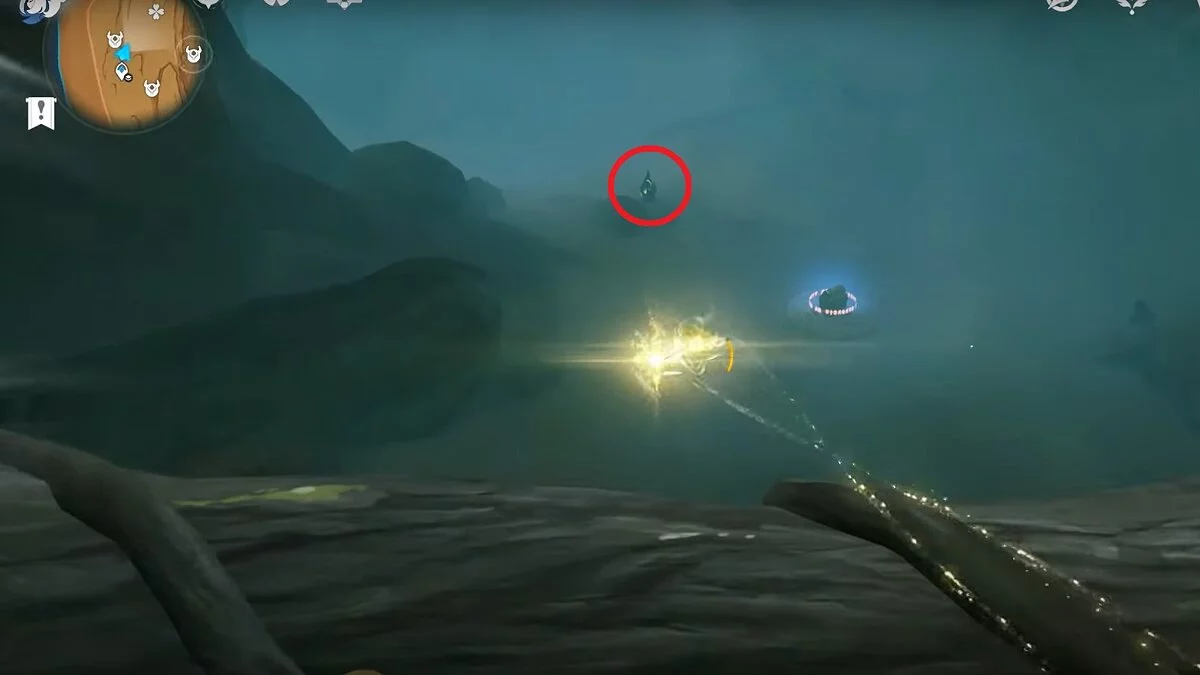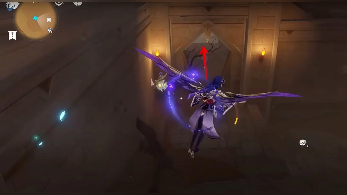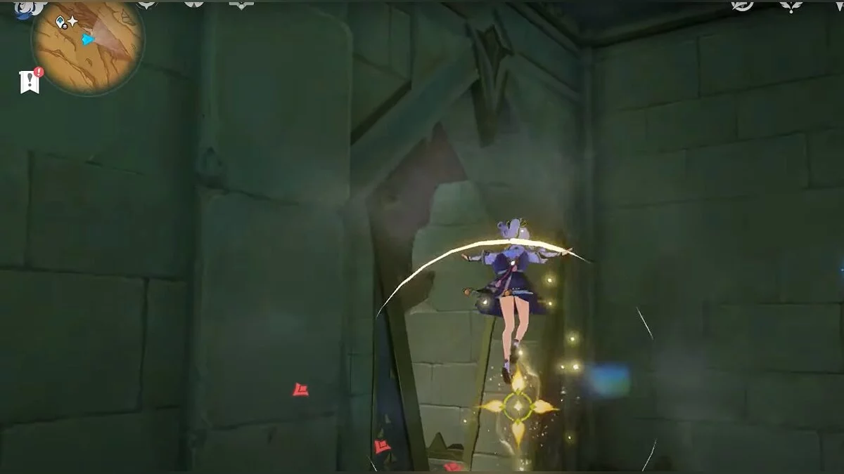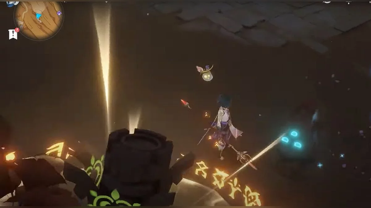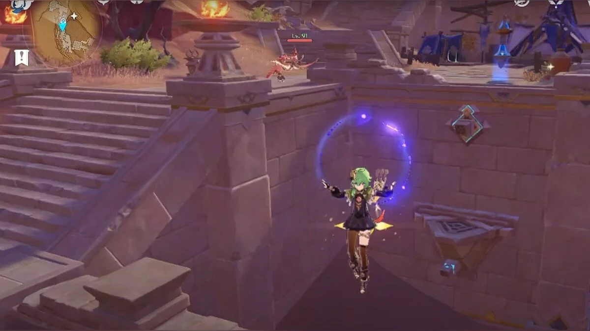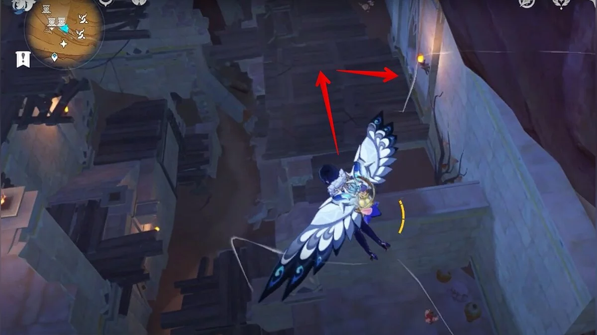 Останется ударить по тотемам Дендро-атакой. Обратите внимание на то, что их не два, а пять. Ещё три штуки находятся на стене. Их местоположение мы указали на скриншотах. Займите позицию на ветке, переключитесь на Дендро-лучника и расстреляйте тотемы.