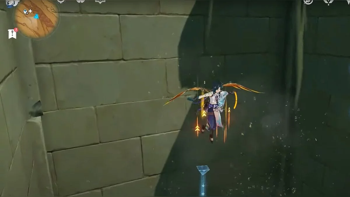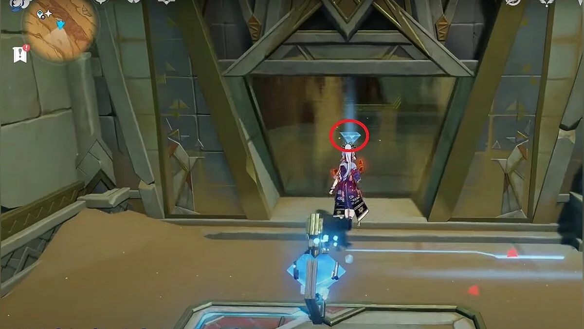 Рядом с ним парит голубая пирамидка. Подберите её. Около активированного кристалла есть поток воздуха, на котором нужно взлететь вверх.