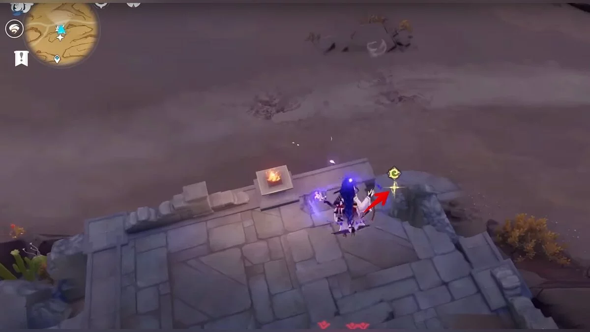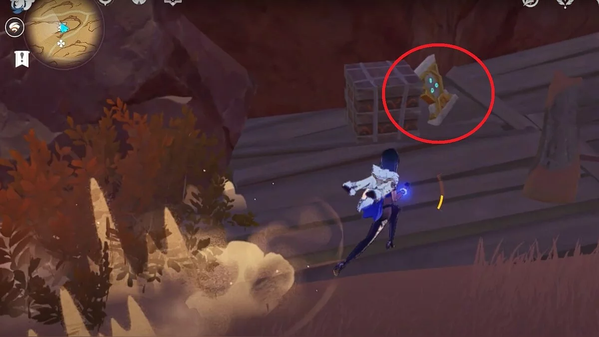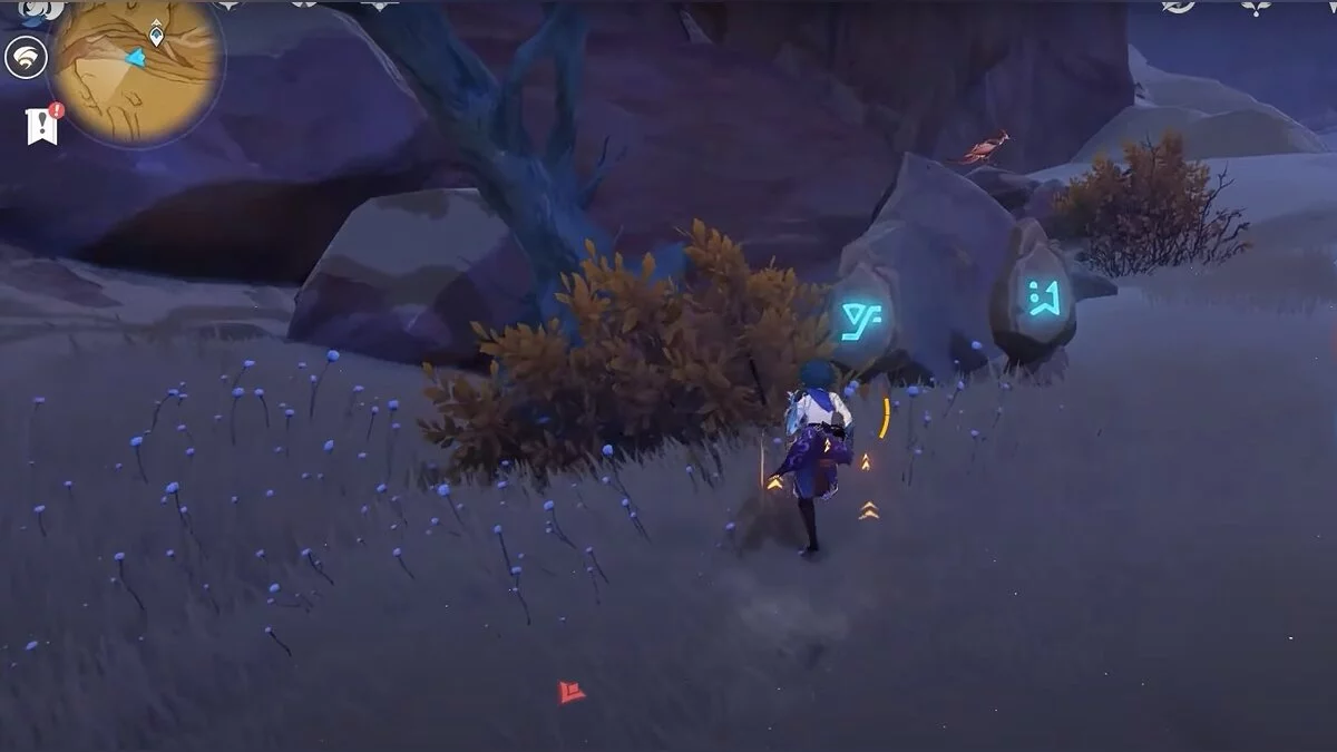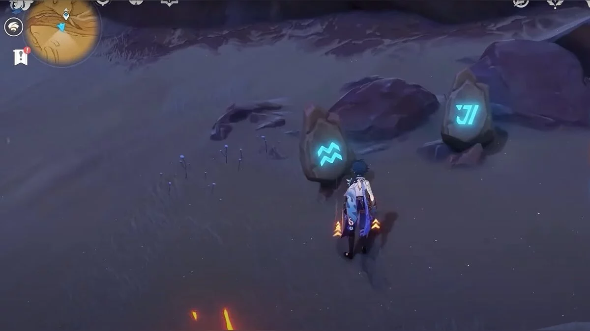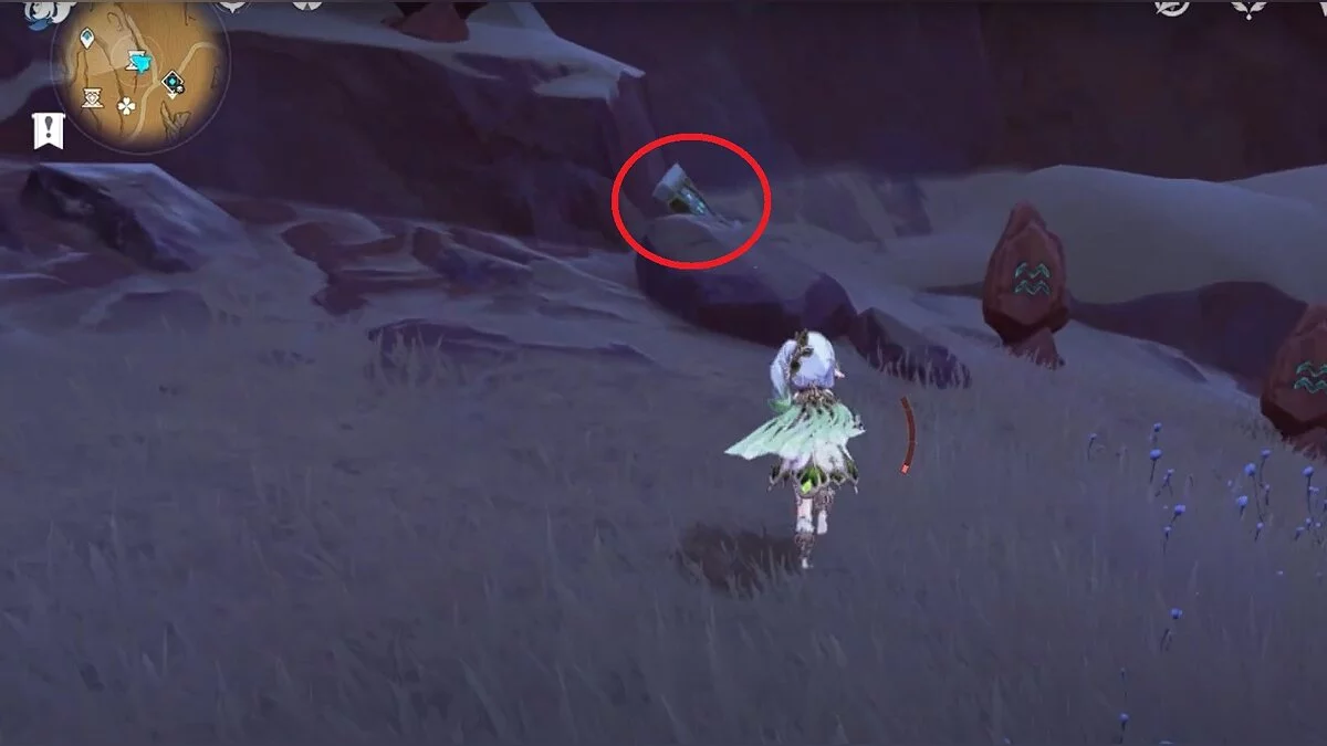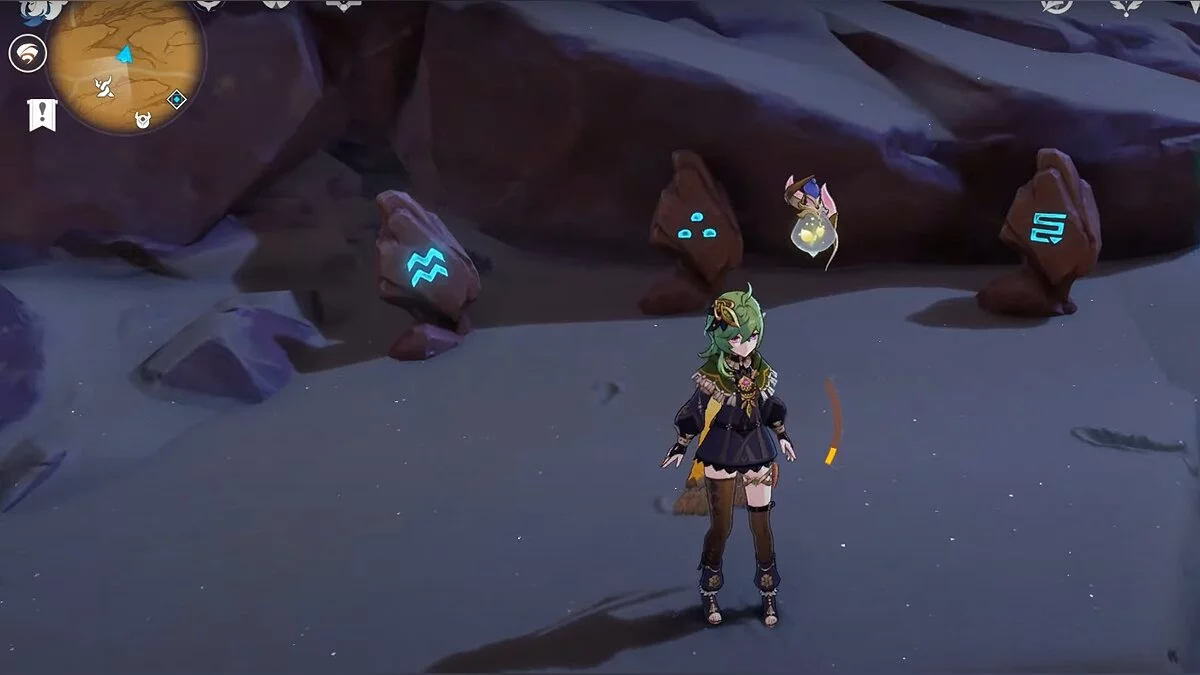 Спускайтесь со скалы вниз. Вы увидите дендро-тотем и ещё три камня.