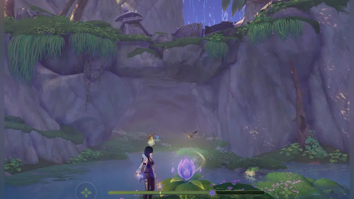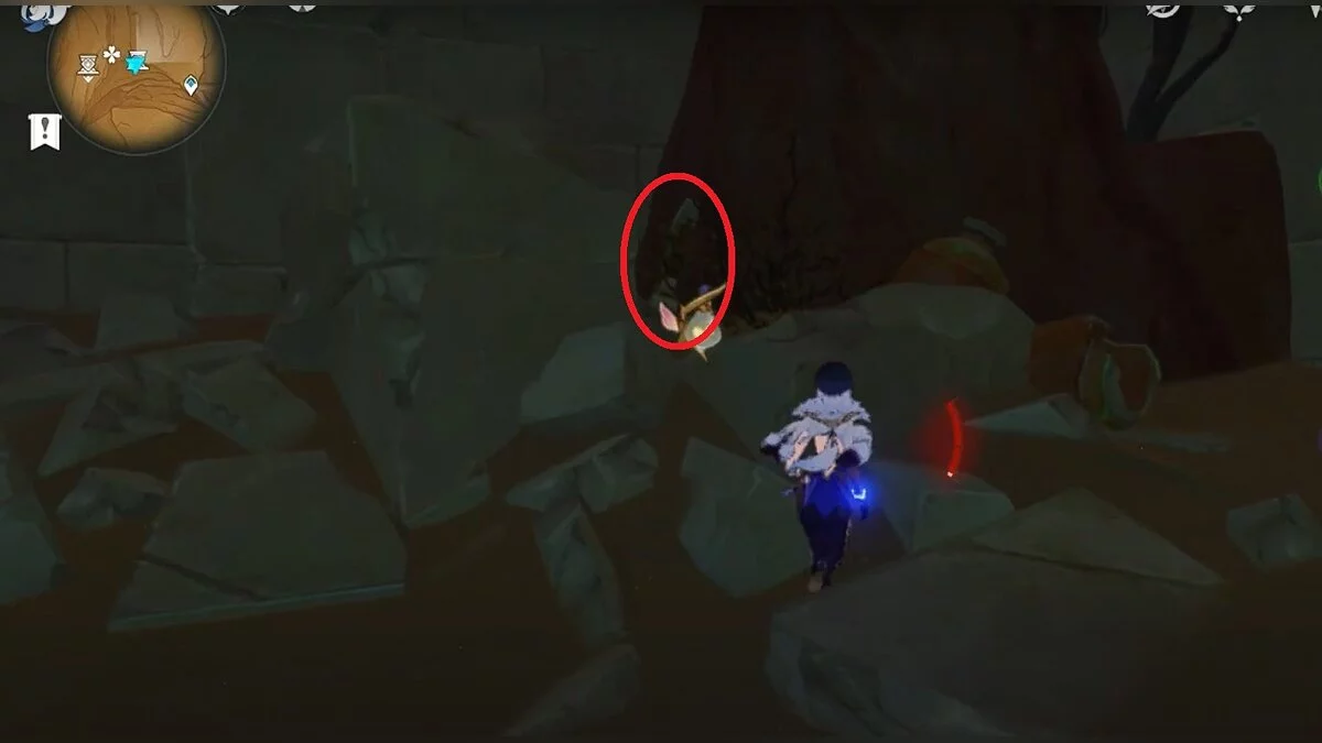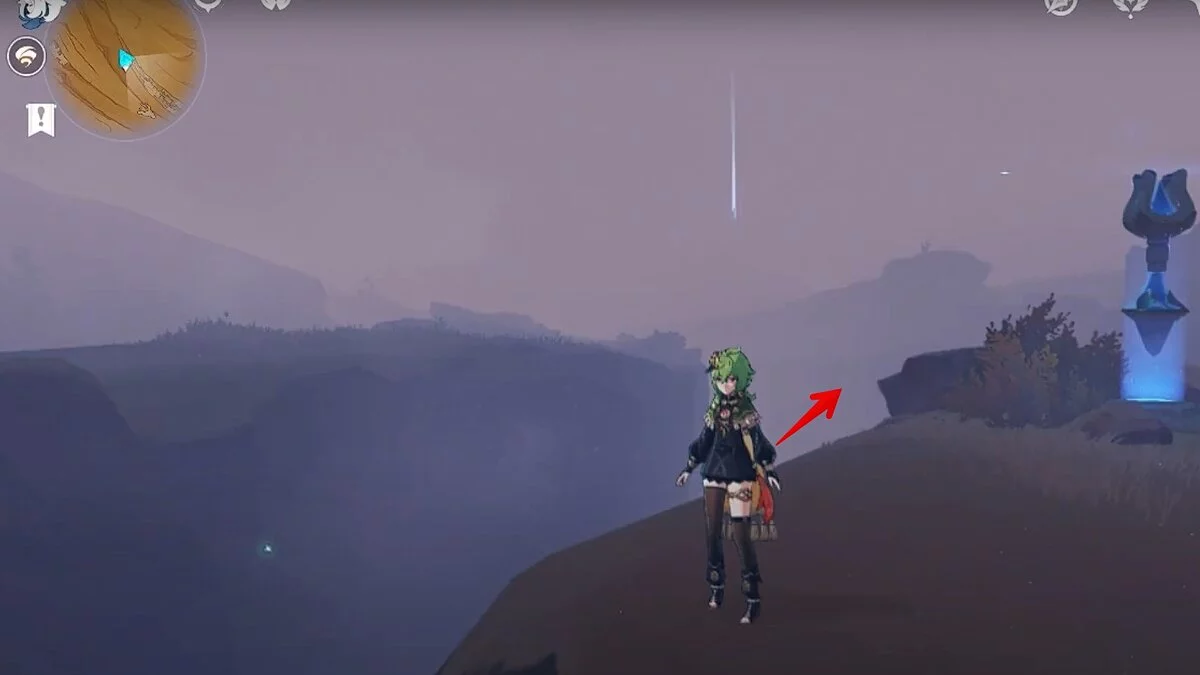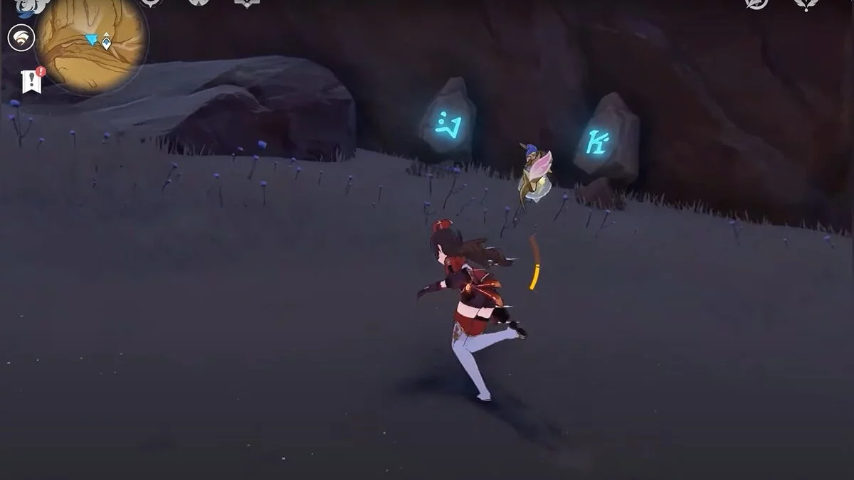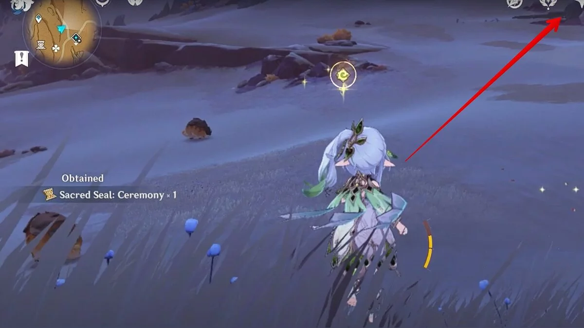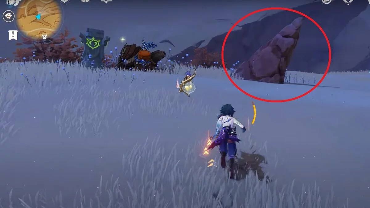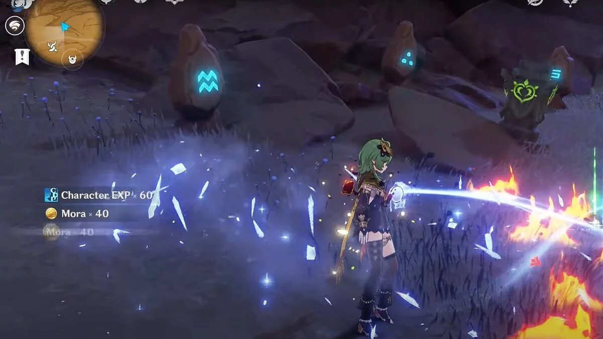 Спускайтесь со скалы вниз. Вы увидите дендро-тотем и ещё три камня.