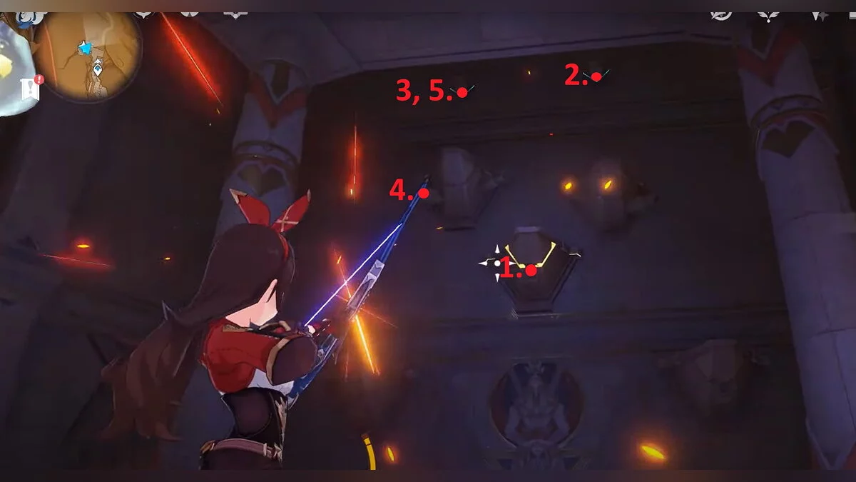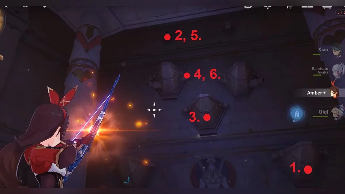 После этого стреляйте по другим точкам на левой стене. Нужная последовательность обозначена на скриншоте.