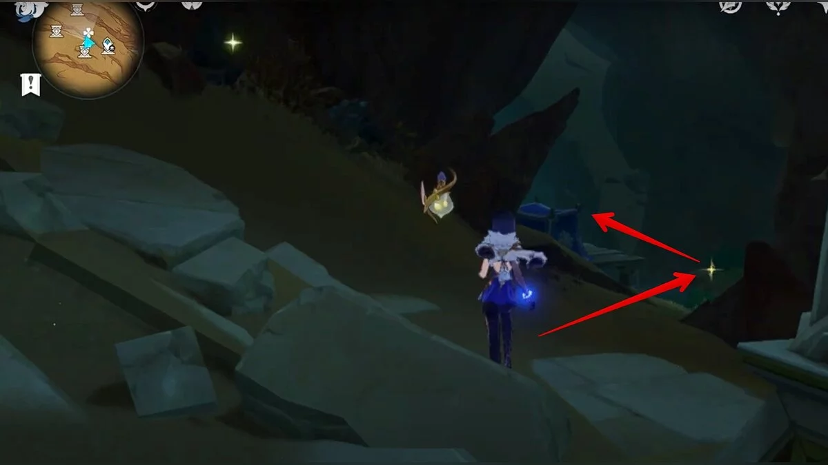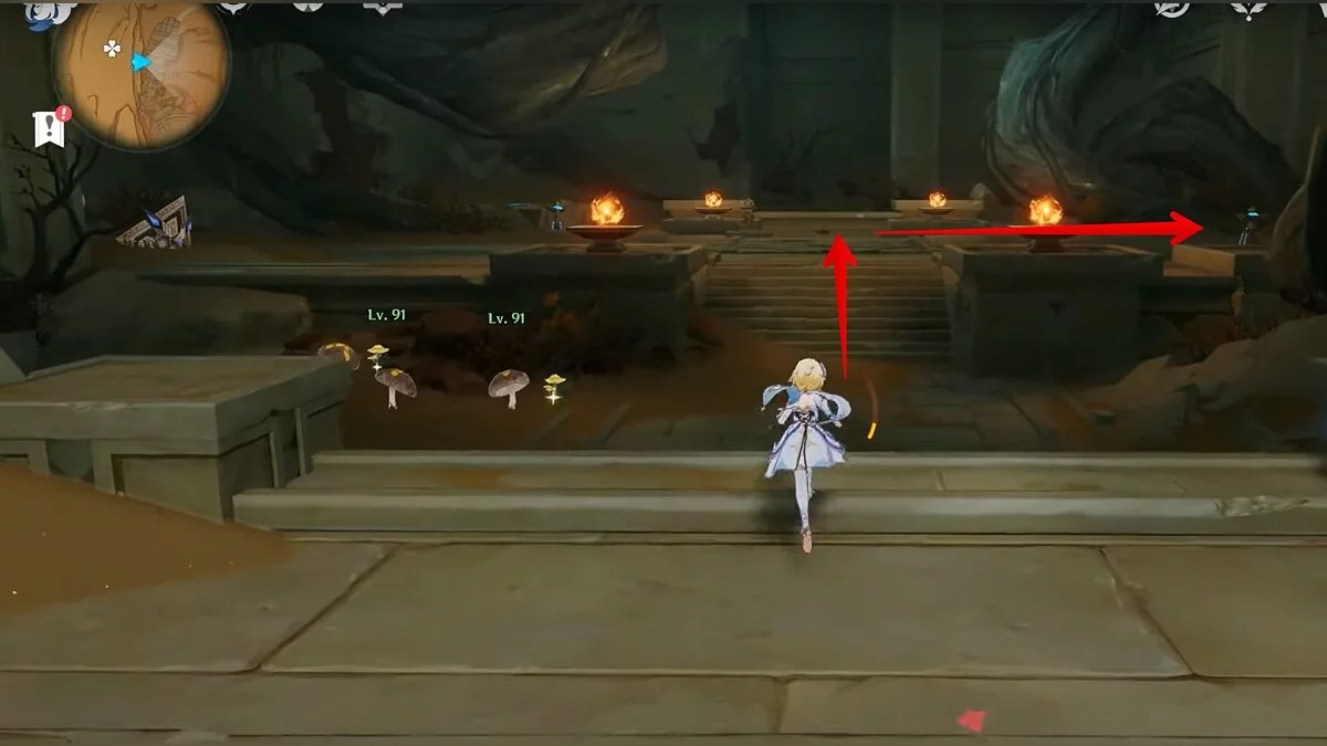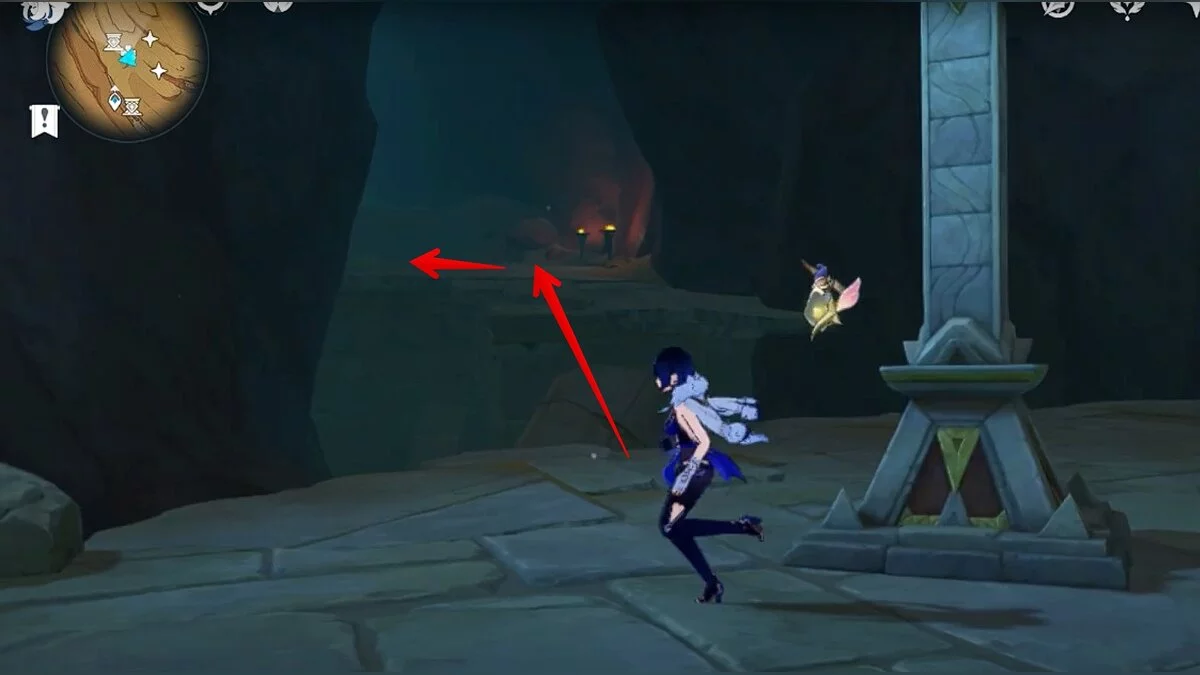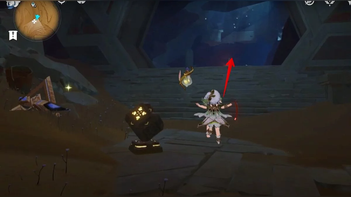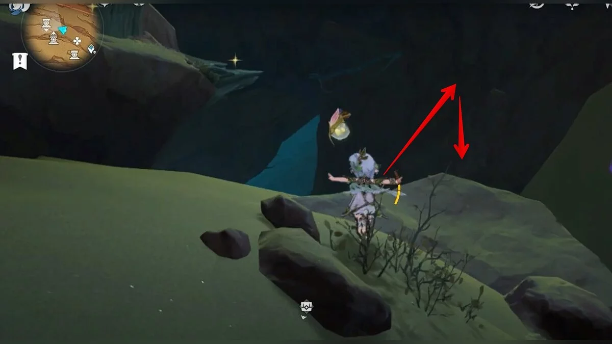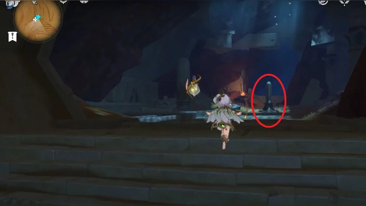 Двигайтесь на восток и отыщите каменную лестницу. Можете воспользоваться светлячками для быстрого перемещения. В полу вы должны увидеть небольшую дыру. Прыгайте в неё.
