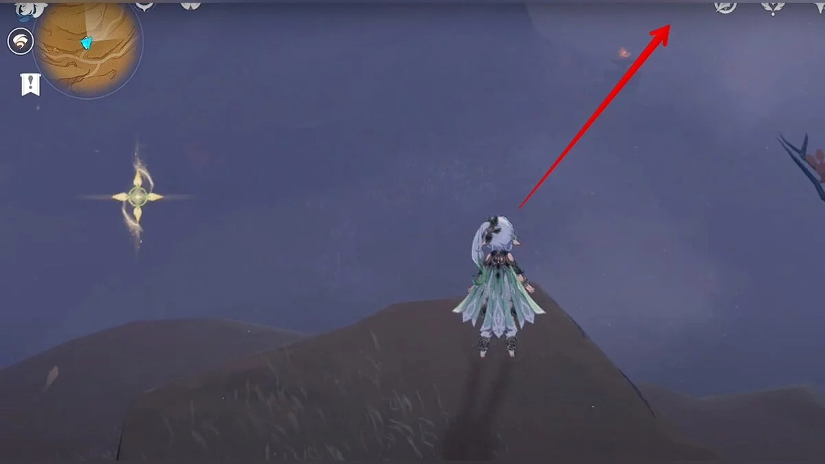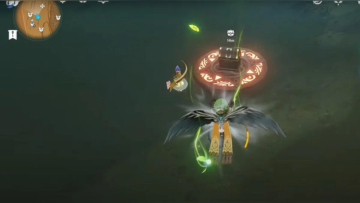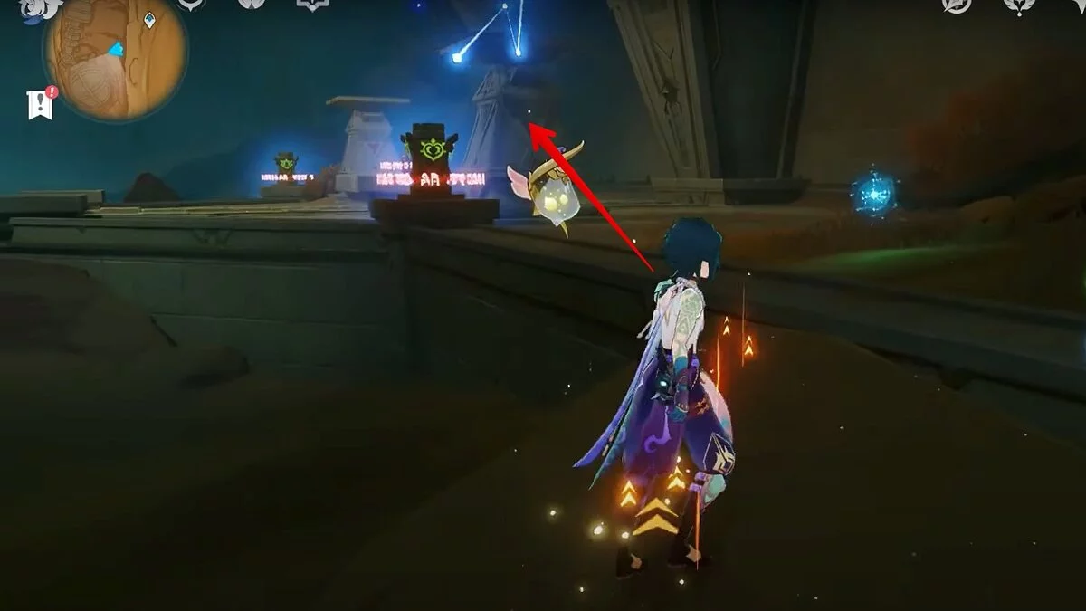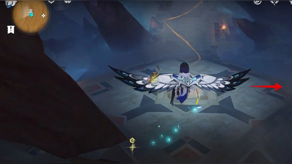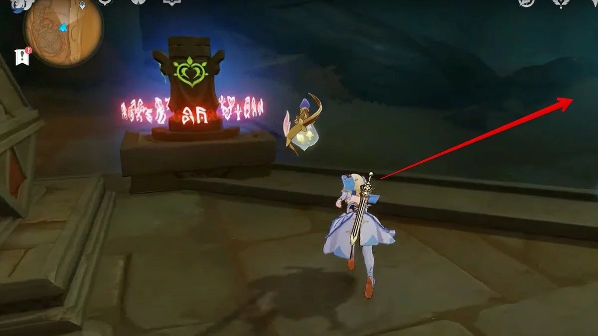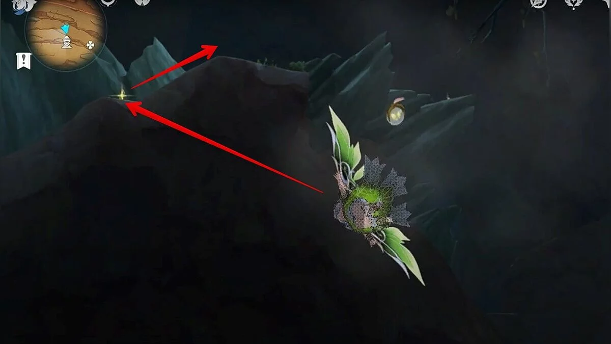 Прыгайте вниз и летите на северо-восток. Можете воспользоваться светлячками для ускорения перемещения. Доберитесь до обелиска и взаимодействуйте с ним.
