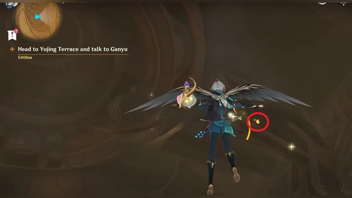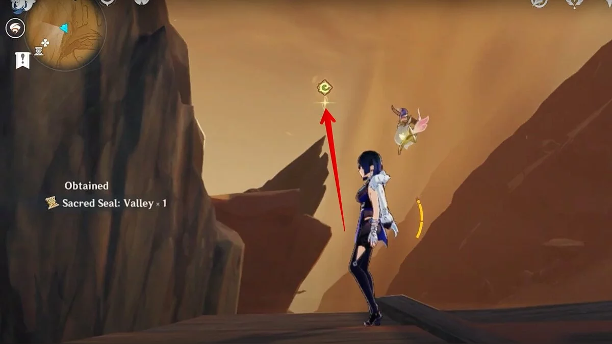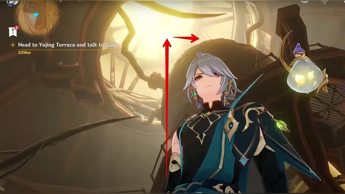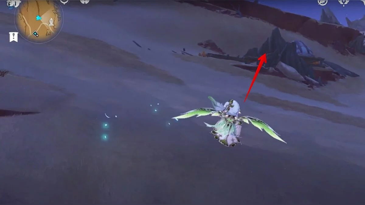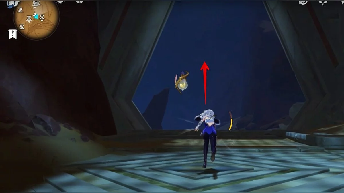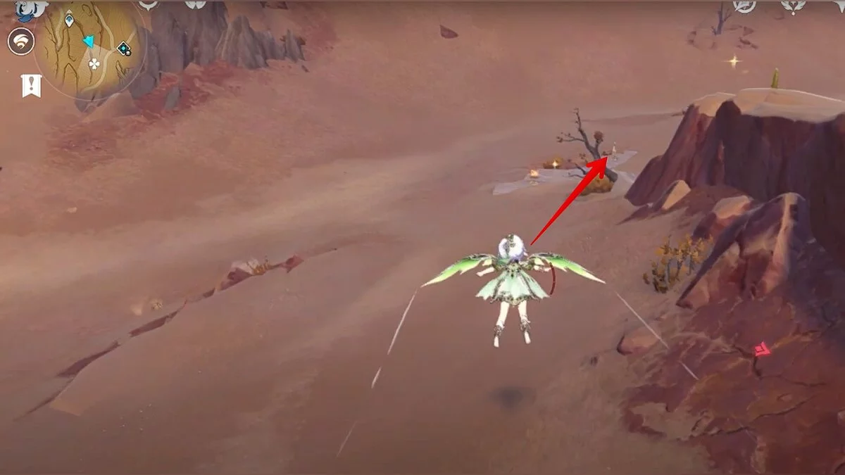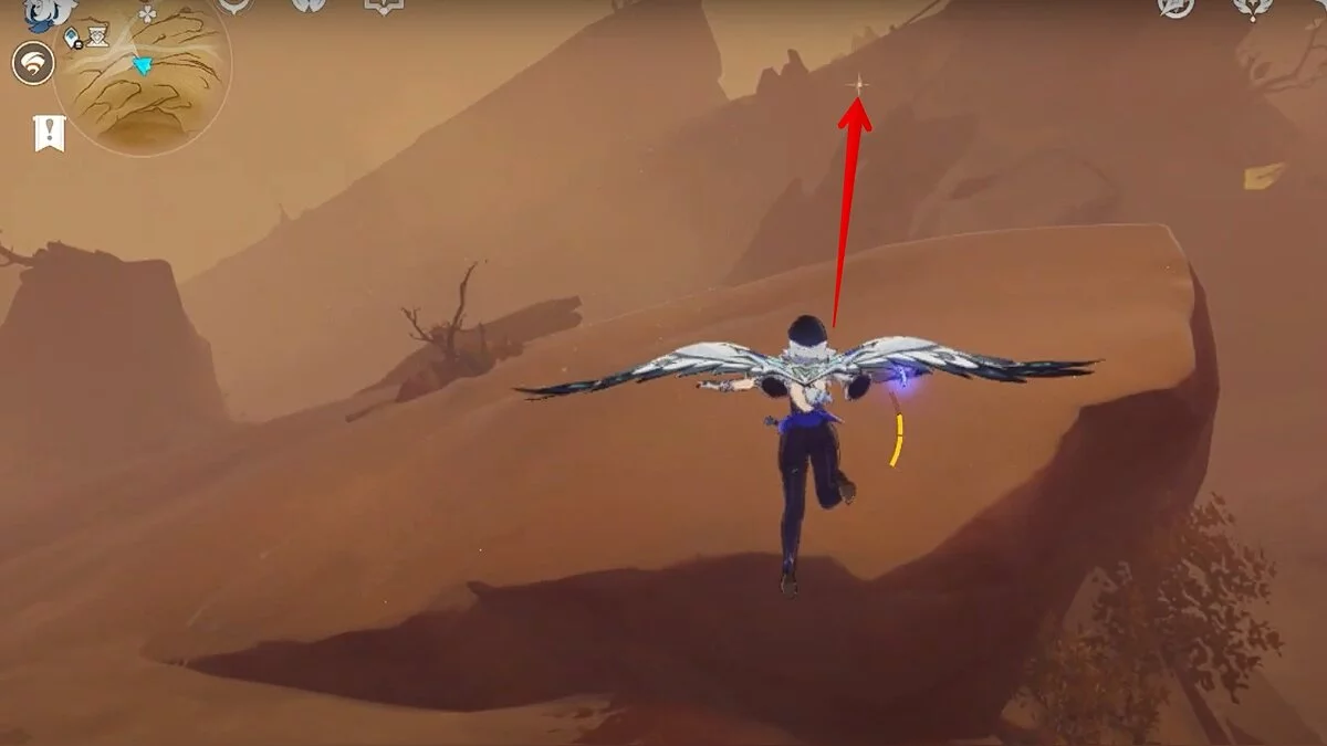 Прыгайте вниз и летите на северо-восток. Можете воспользоваться светлячками для ускорения перемещения. Доберитесь до обелиска и взаимодействуйте с ним.