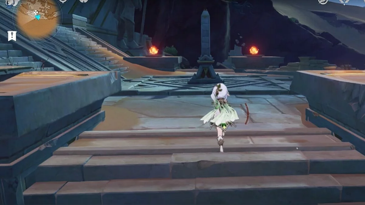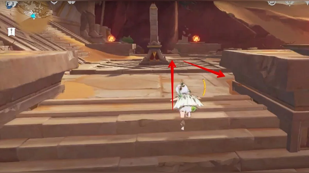 Двигайтесь на юг. По ступенькам поднимайтесь наверх и взаимодействуйте с обелиском.