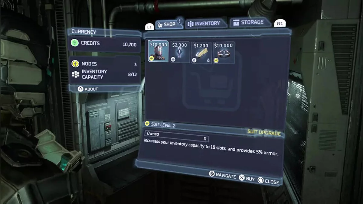 Всего в Dead Space есть шесть уровней защитного костюма, каждая из которых улучшает броню, инвентарь и открывает новые узлы.