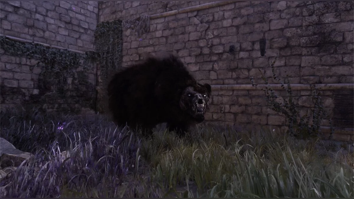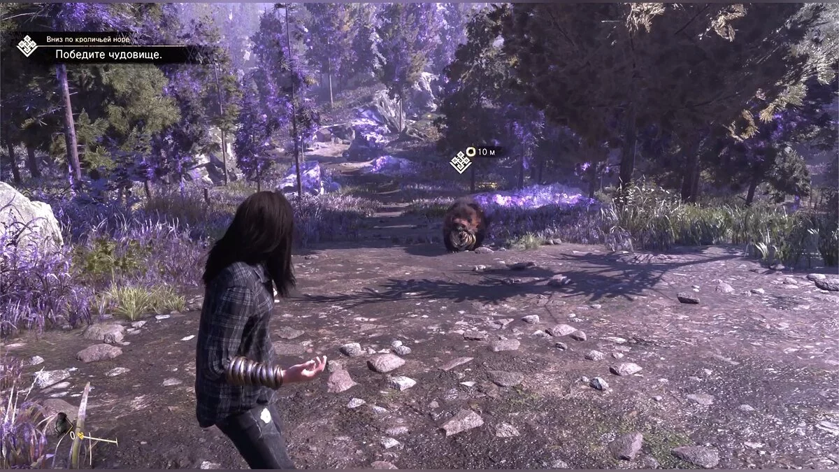 За стенами вас ждет первый бой. Разберитесь с животными и следуйте за светом от браслета. По пути подберите целебный отвар. Добравшись до руин, победите уже знакомых зверей, а затем медведя.