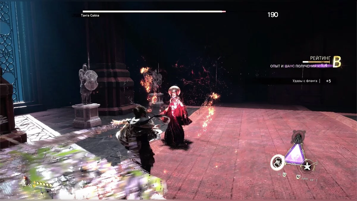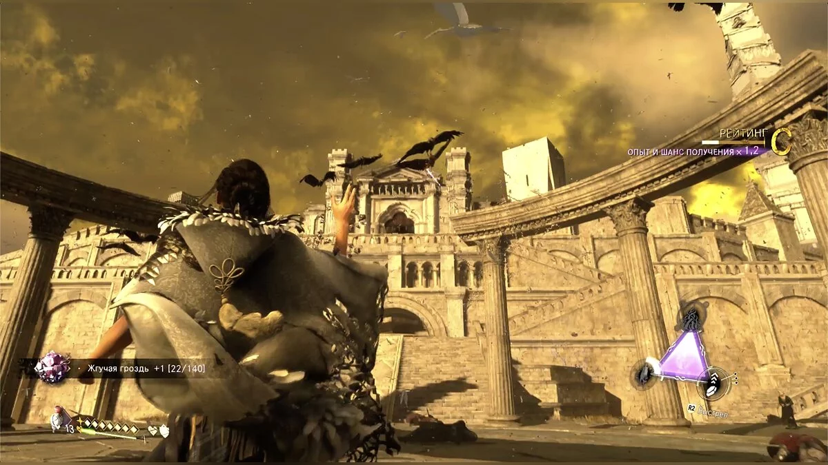 Чтобы успешно их уничтожить, используйте захват цели. К сожалению, игра плохо удерживает прицел, поэтому фиксатор нужно постоянно возвращать назад на крылья. Как только одно крыло загорится — рыцарь не сможет взлетать, однако его атаки станут опаснее. Воин ускоряется, оставляя за собой огненный след, придется увернуться несколько раз, чтобы не попасть под такой опасный рывок.