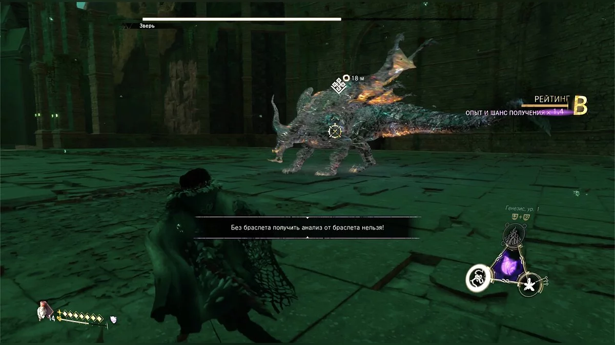 Дракон активно бьет хвостом, однако от этого удара легко увернуться. Здоровье монстра падает достаточно быстро, кроме того, вы параллельно проходите обучение. Когда игра расскажет про неблокируемые атаки, спрячьтесь за каменной стеной и подождите, пока монстр перестанет изрыгать пламя. После этого ящер начнет использовать лапы для атаки. Цельтесь в горящую огнем грудь — это самое слабое место. В процессе дракон еще несколько раз будет плеваться огнем, прячьтесь за стенами.