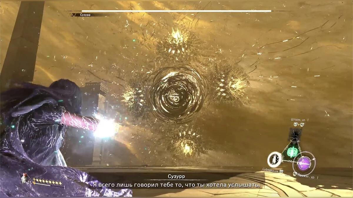 Сначала хороший урон будет наносить магия природы, однако следите за тем, когда демон меняет символ на спине — это значит, что к выбранной стихии он больше не восприимчив. Когда здоровья останется чуть меньше половины, включите силу молний. Если вдруг пропустили этап, найти нужную магию легко — стреляйте в Сузурра и наблюдайте, появится ли надпись «уязвимость».