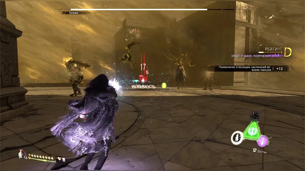Когда отнимете ¼ жизней, Сузурр взлетит, а огонь перестанет помогать. В эти моменты будьте особенно внимательны — все его атаки по площади, увернуться очень сложно. Приемов несколько — золотая птица, множество огненных шаров или молнии на полу. Не забывайте использовать телепорт — он все еще работает. Лучше вообще не атаковать демона, пока он в воздухе и сосредоточиться на уклонении. Босс в итоге все равно приземлится, а вы сохраните много жизней.
