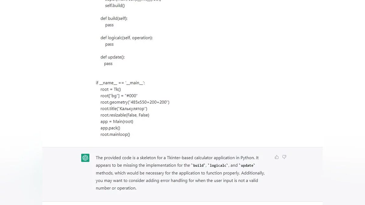 Если есть код с ошибкой, то ChatGPT поможет вам с этим. Он проанализирует нужный кусок или весь код и покажет, что могло пойти не так, а также приведёт несколько примеров, что упростит понимание.