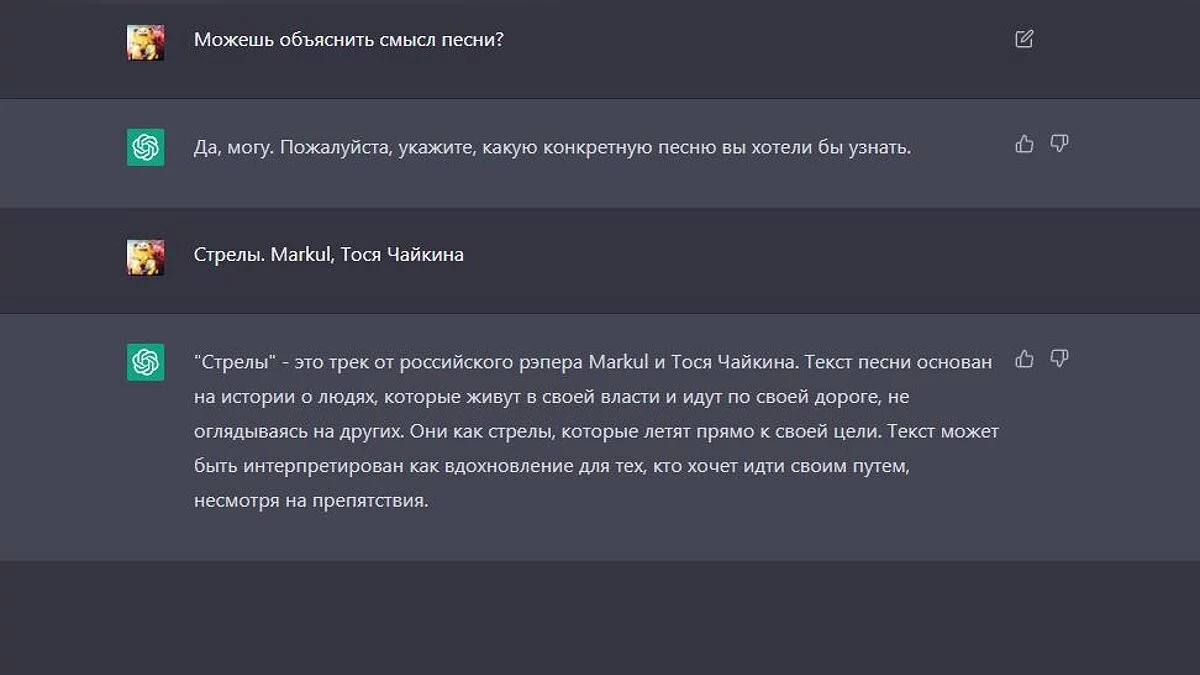 Многие треки после прослушивания вызывают вопросы. Нейросеть без проблем расскажем вам, о чём была песня. При этом, если нажимать кнопку «Regenerate response», то можно будет узнать теории фанатов или другую интересную информацию о песне.