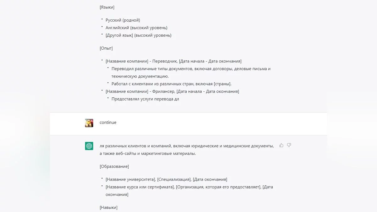 Это связано с ограничением на вывод данных. Ответ на русском языке занимает больший объём, чем английский, и требует на это больше времени. Достаточно написать слово «continue», чтобы бот продолжил выводить свой ответ с того места, где остановился.