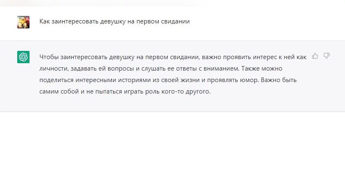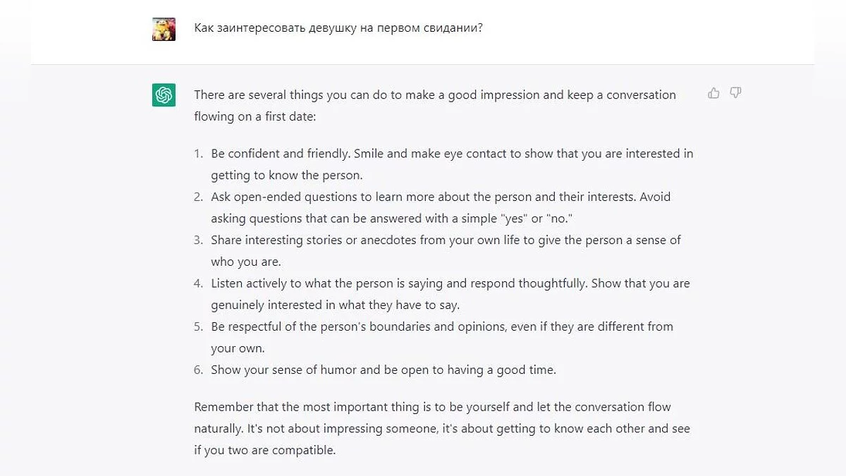ChatGPT можно использовать как общение с другом. Можно запросить шутку, просто поговорить или обсудить интересные темы. Если вы спрашиваете на русском, то время от времени бот начнёт отвечать на английском. Просто обновите страницу и повторите свой вопрос. Но учтите, что на английском получается более развёрнутый ответ.