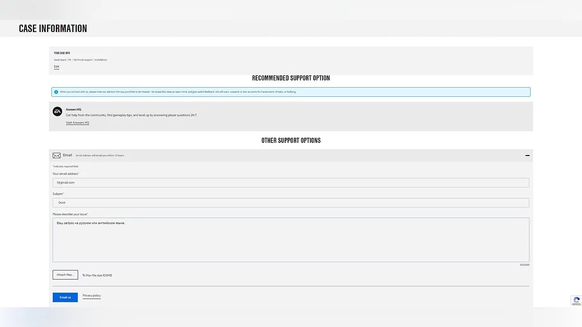 - Введите своё сообщение на английском языке (это повысит вероятность ответа англоязычных пользователей) и используйте кнопку «Выберите файл» для загрузки скриншотов.