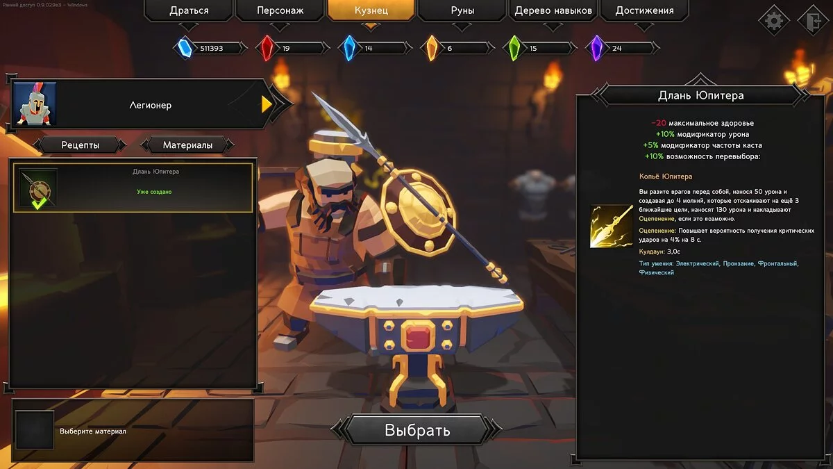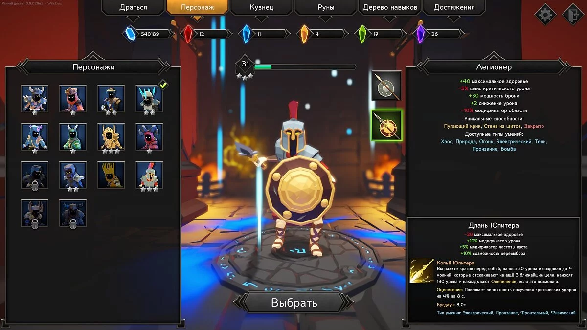 Самый слабый персонаж на сегодня. Его создали очень живучим, но в игре нет адекватных навыков, которые помогали бы танкам наносить урон. На высоких уровнях сложности враги наносят слишком много урона, поэтому здоровье, сопротивление и броня отходят на второй план, нужно лишь наносить урон. Активный навык «Копьё Юпитера» (зелёное оружие Легионера) прекрасно сочетается со сборками в крит и с навыками типа «Электрический». В игре есть возможность получить умения из других областей, но это потребует слот в рунах. Руны «Мастерство: Мистический» и «Мастерство: Святой» помогут открыть соответствующие ветки навыков и стабильно проходить уровни, хотя бы для достижений. Активные навыки «Волшебный шар», «Буря копий» и «Колдовская перегрузка» помогут нанести достаточно урона, но забеги будут долгими.